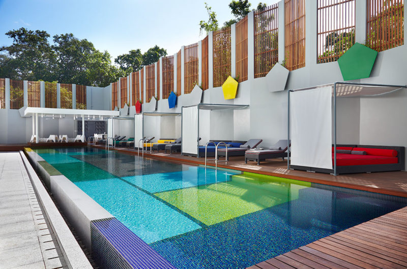 Each room is fitted with a balcony that overlooks the playful and colorful swimming pool.