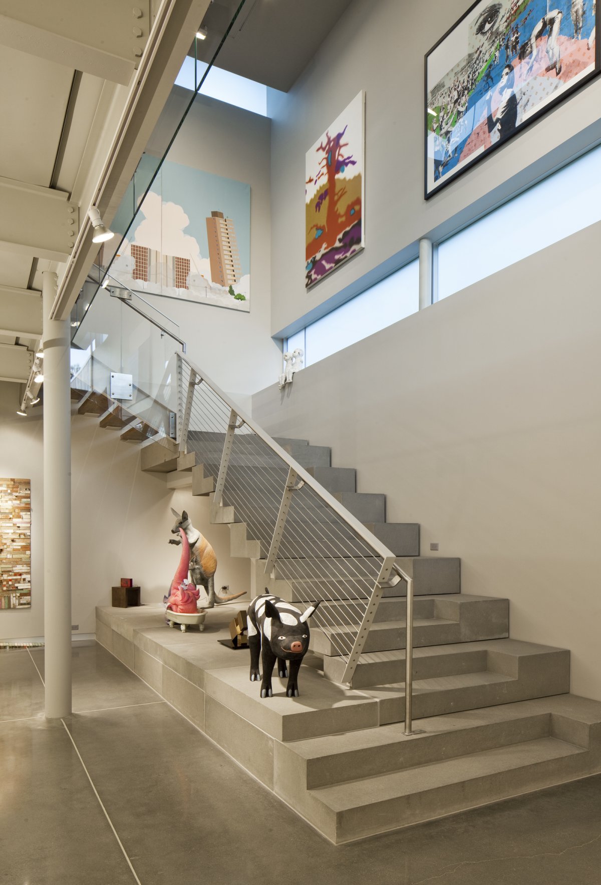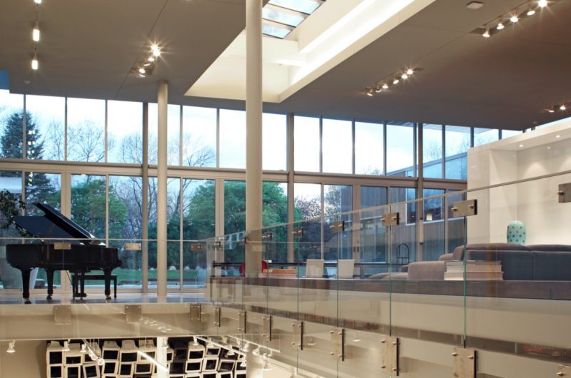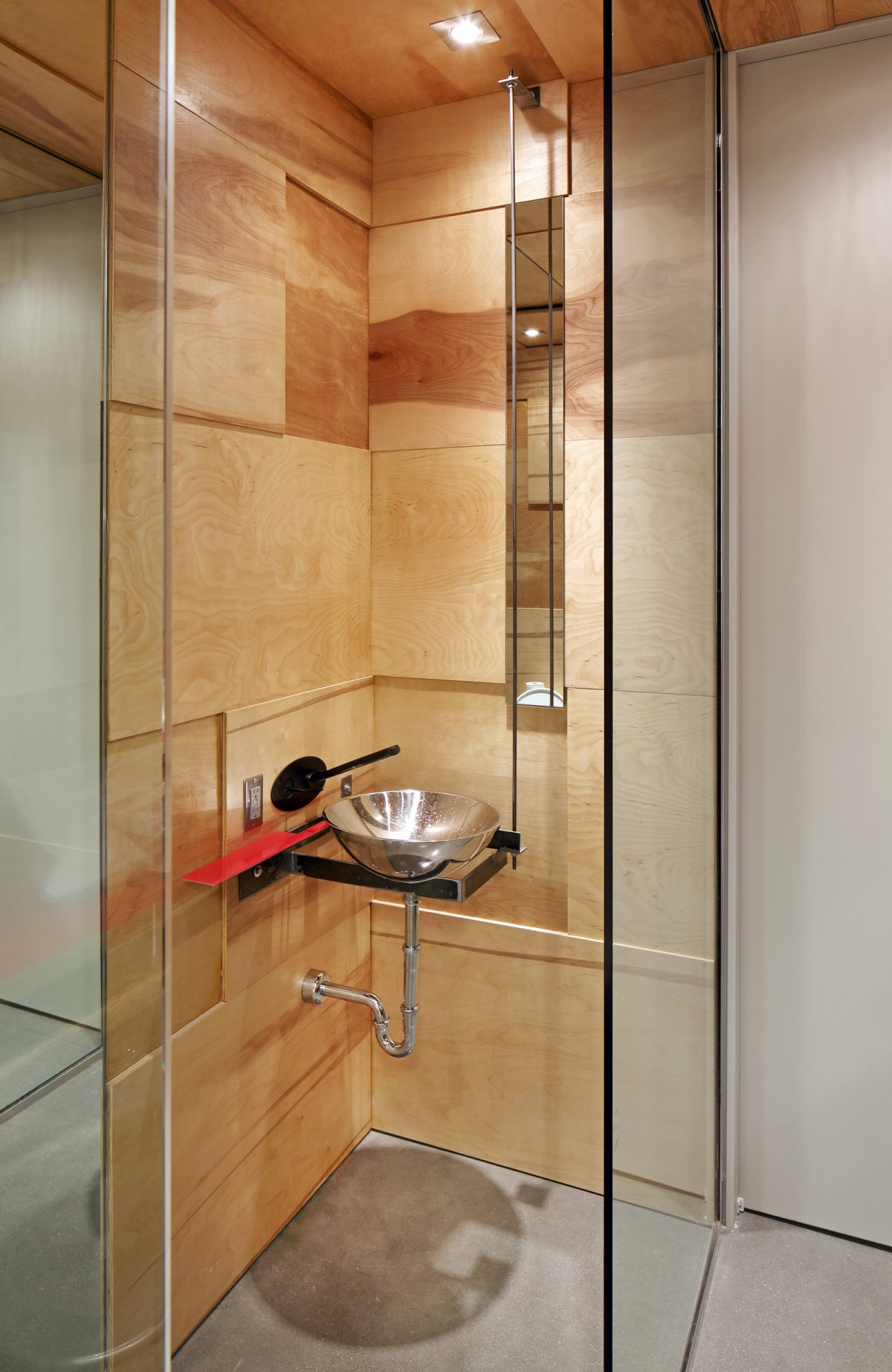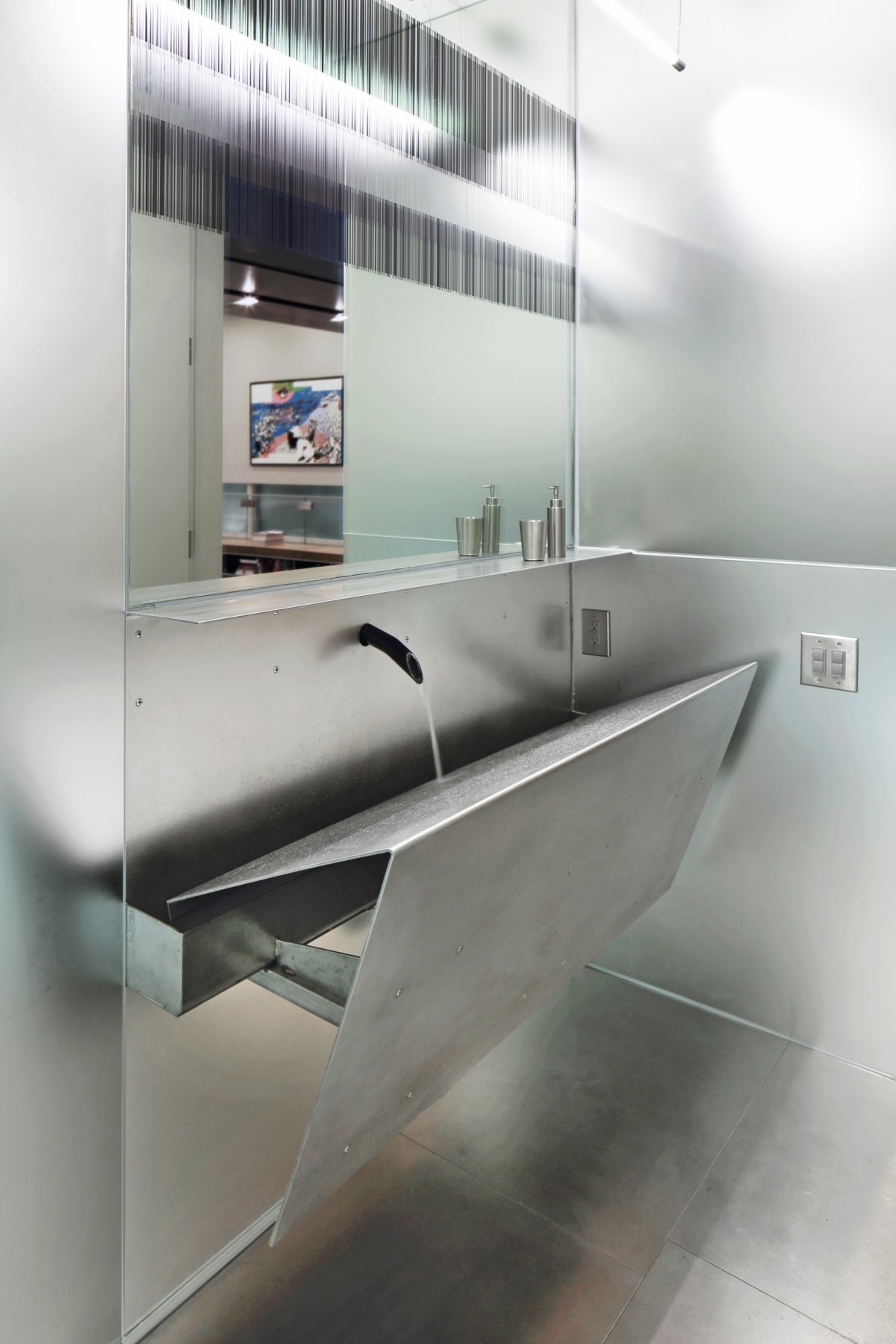There is a centrally situated “wet cube” in the house, featuring white reflective automotive paint finish. This space works as a kitchen pantry while also delineating the different functional zones of the residence. Check out the gallery for more photos of the ART[house] in Omaha, Nebraska.