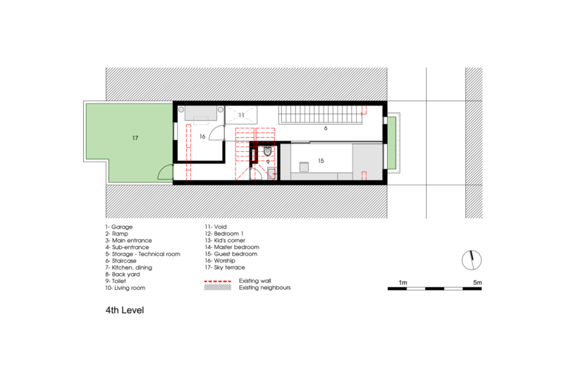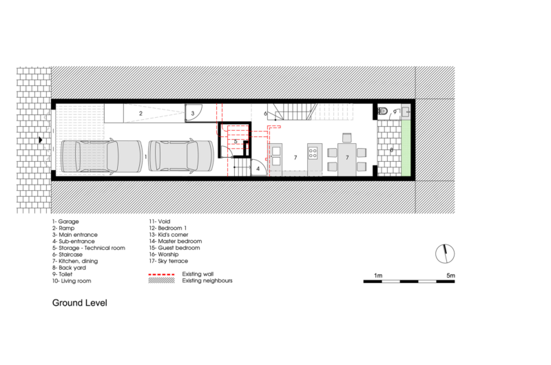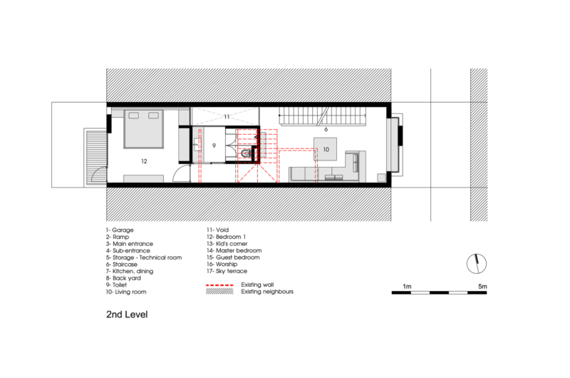 Its design was based on the requirement of the owners who wanted a garage for two cars, a kitchen on the first floor, a bedroom and a living room on the second floor, the master bedrooms on the third floor, a guest room and a sky terrace and worship on the fourth floor.
