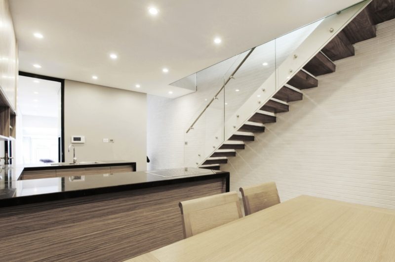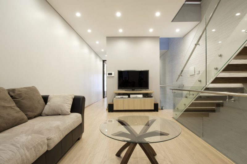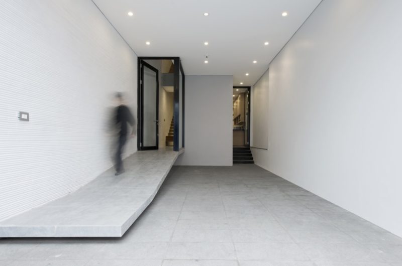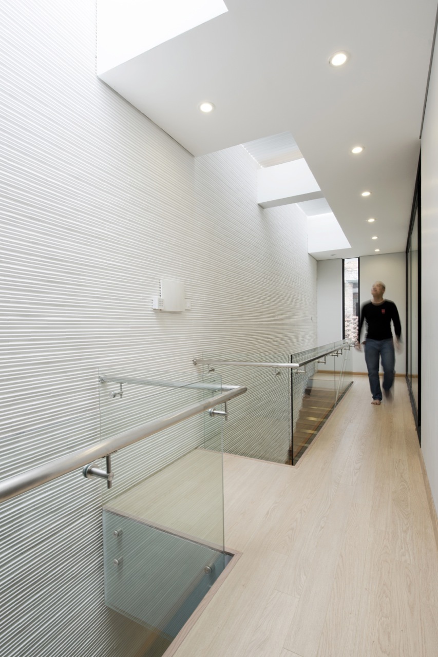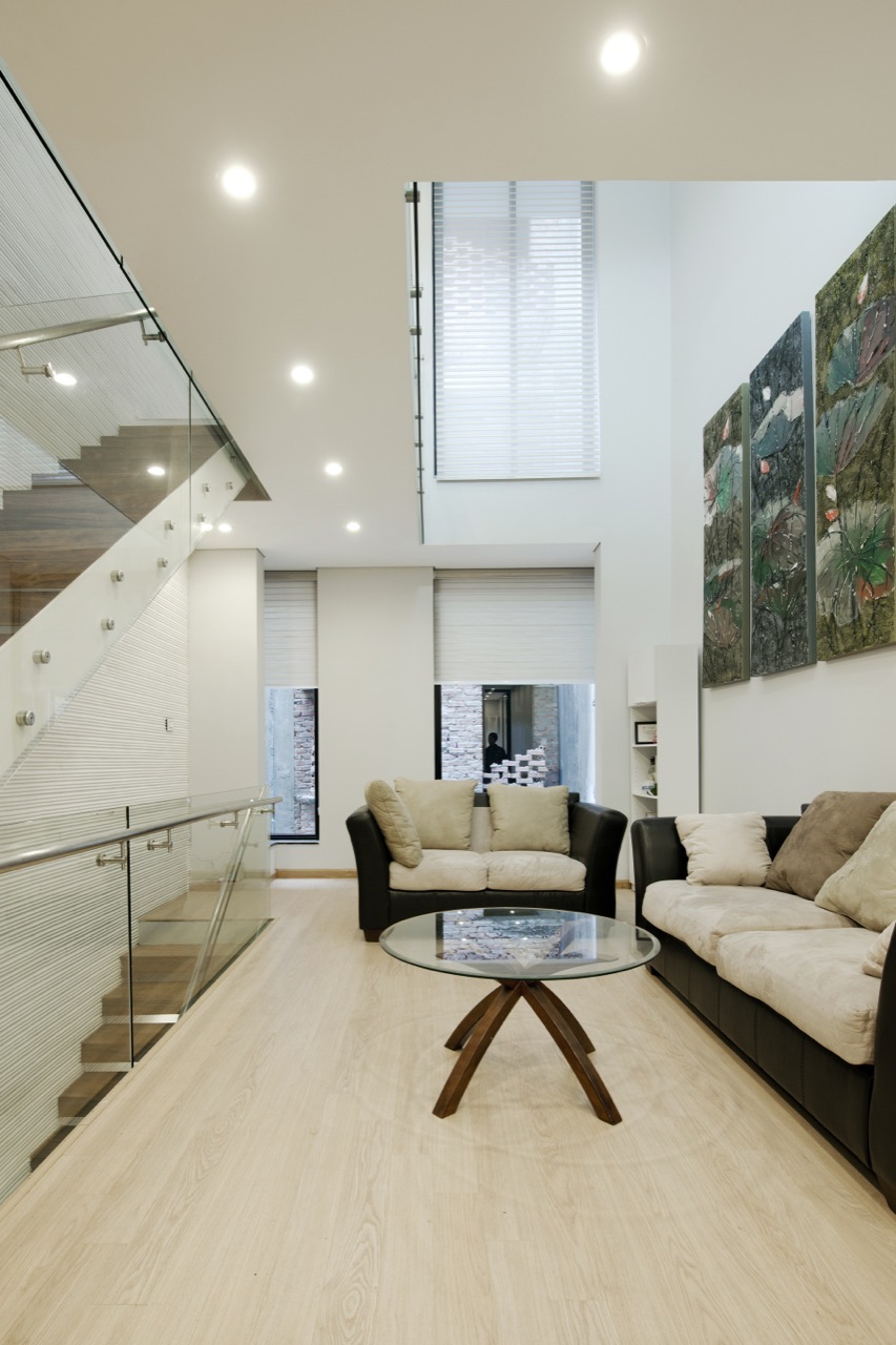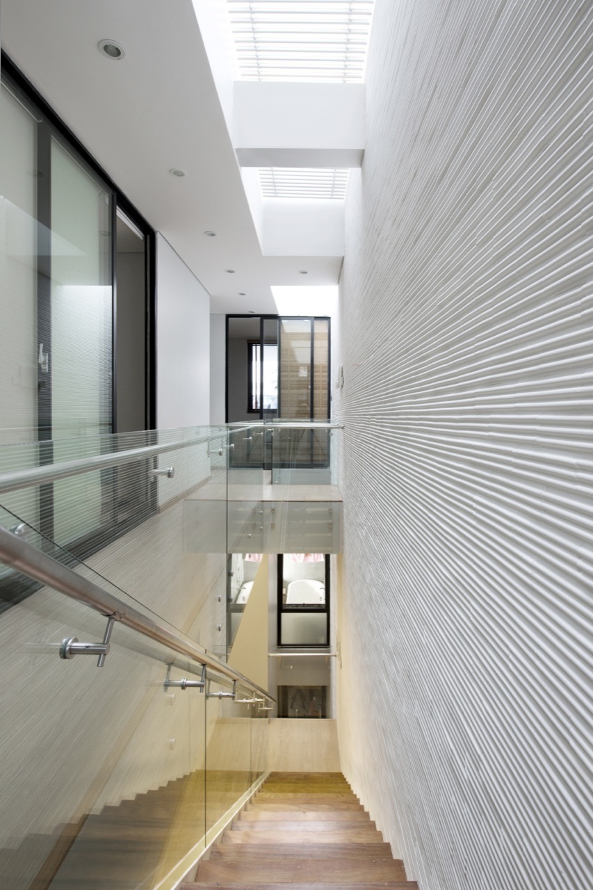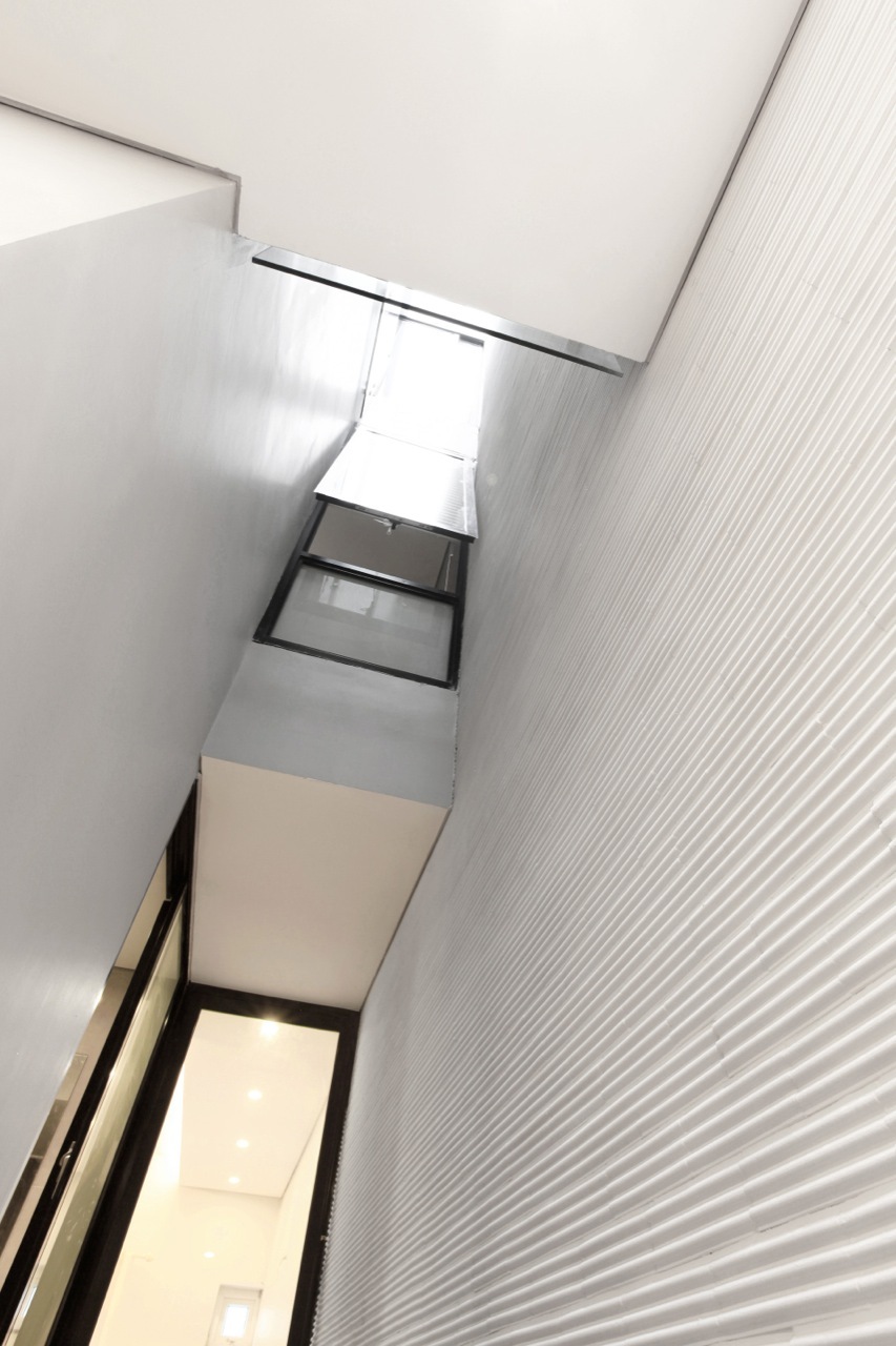 An atrium located in the middle of the house that connects the four levels vertically, allows the daylight to enter in the lobbies and all the rooms.