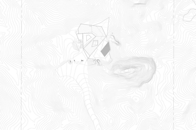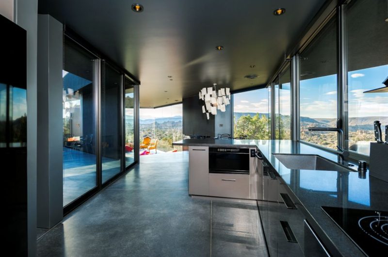 The dark color used for the exterior walls, gives the house a cave-like feeling and because of that during the day the views are more pronounced, and during the night the house completely dematerializes.
