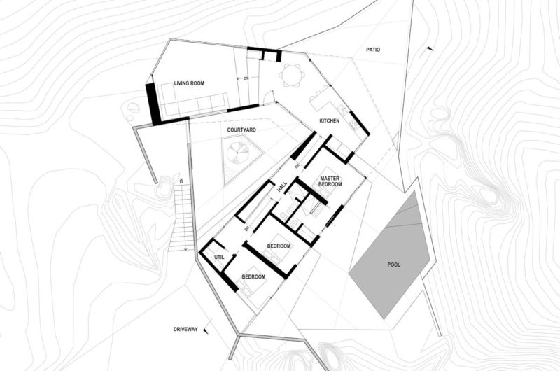 The core of this house is practically the inner courtyard, which is surrounded by the rooms that are arranged in a linear sequence from living room to bedroom with the kitchen and dining room in the center.