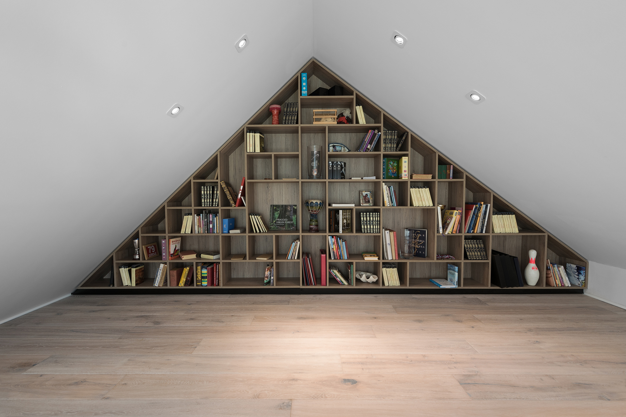 Color contrast of the interier is not as strong as the exterier’s – prevailing are the natural shades and patterns of wood and white wall surfaces. Dominant element object is the carefully designed central staircase that also represents the heart of the building.