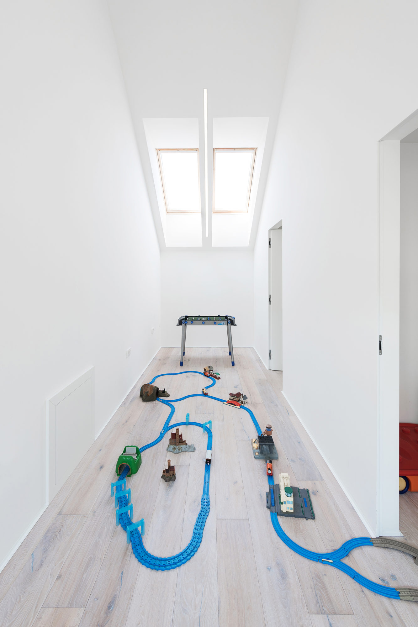 The upper floor of the central volume includes a private bathroom, walk-in closets and sleeping rooms for the children. The heart of the structure is the central staircase, which provides quick and easy access to the most important parts of the abode.