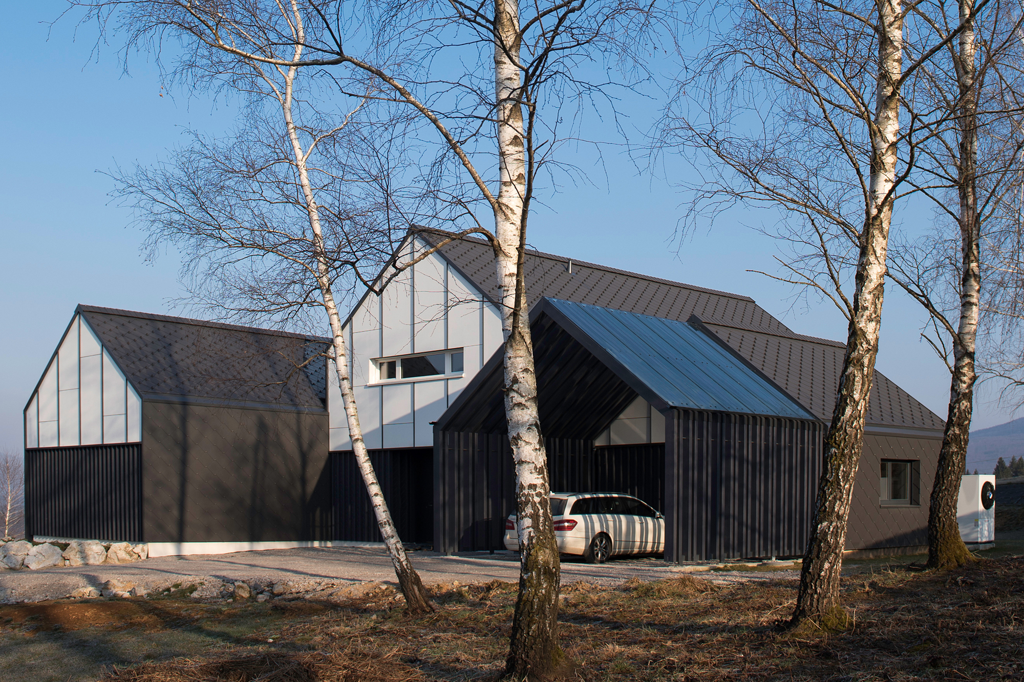 Uniformed facade and roof’s form emphasize the dynamic of the three volumes especially with the combination of dark and light colour shades as well as the use of the materials themselves – pattern of wood panels and fiber-cement panels. Dark-light contrast facade complements the neighboring birch groves and its surrounding landscape. The final result presents a dream house for the investor and a quality addition to the Slovenian residential topography as well.