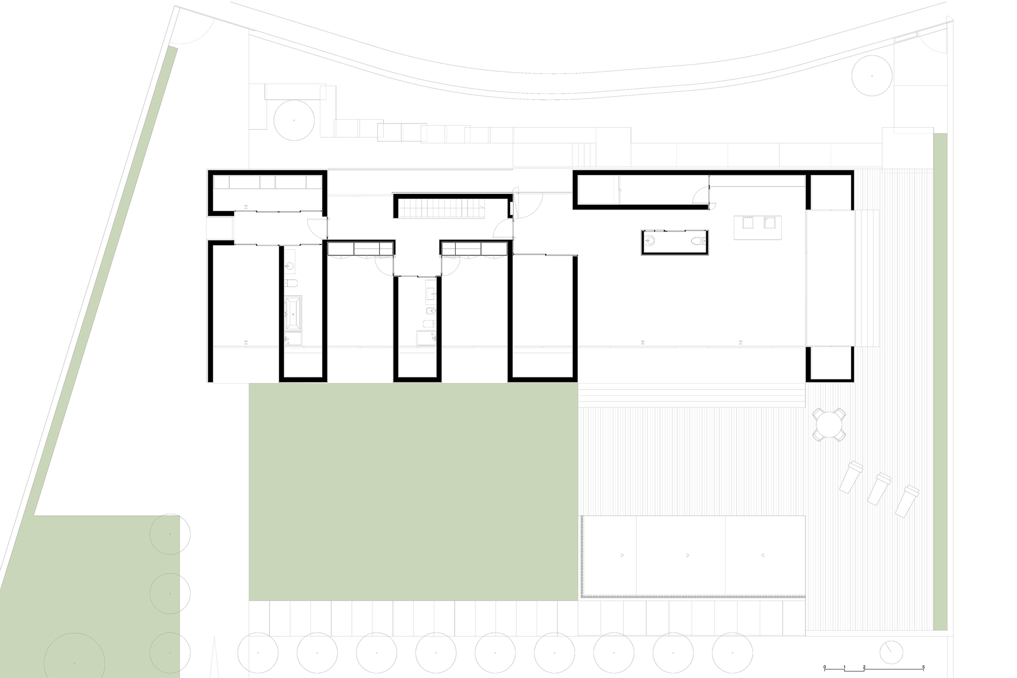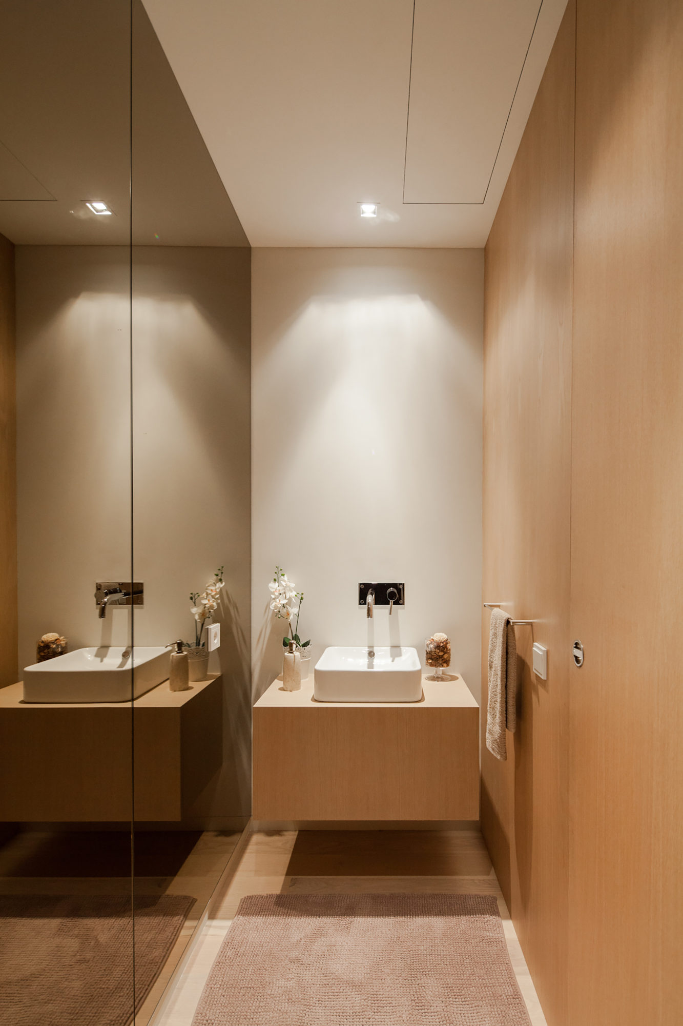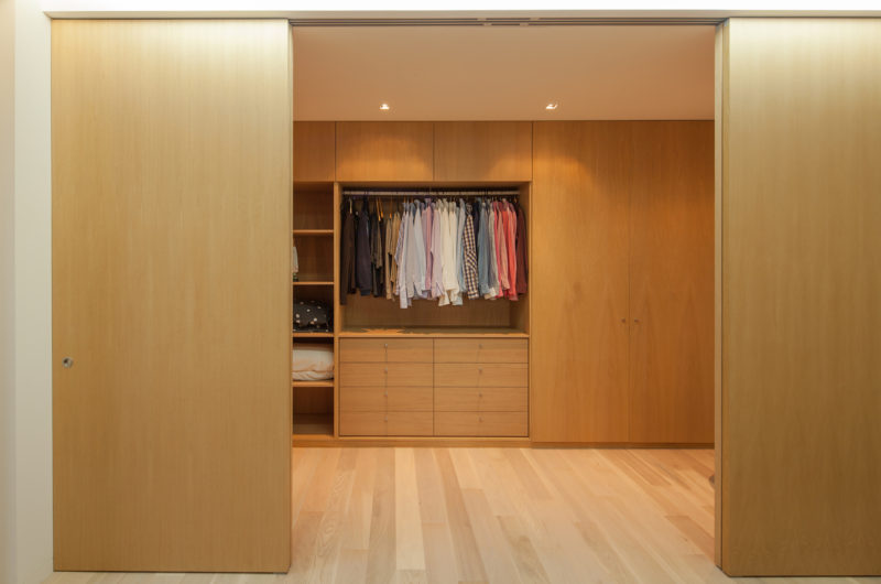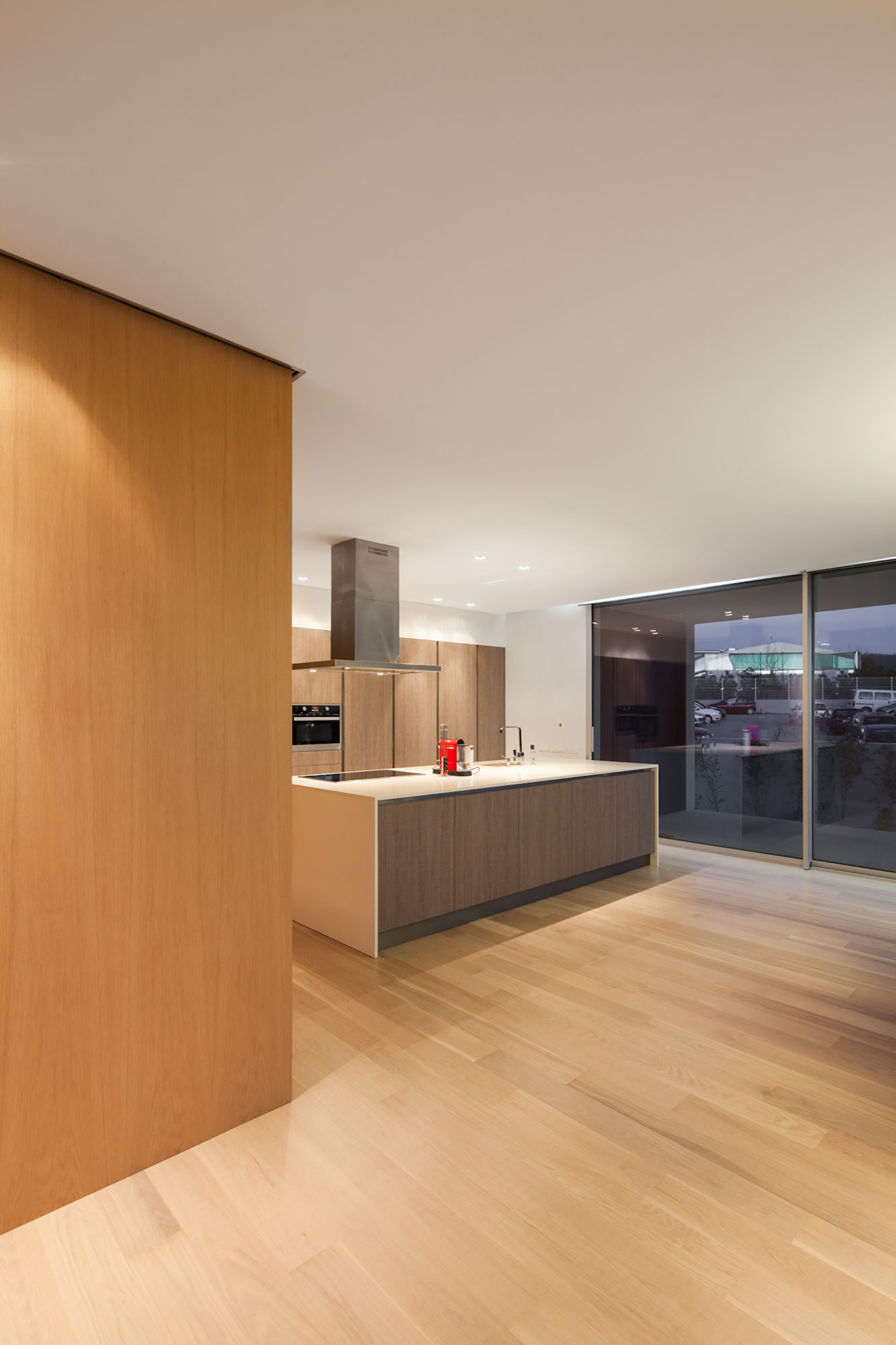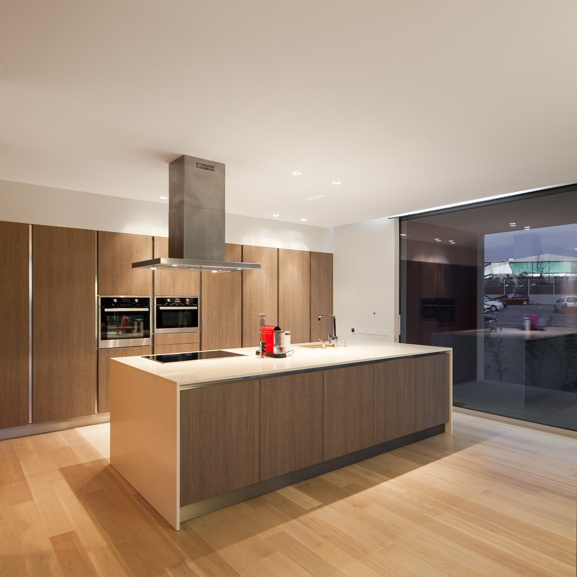 Inside, we find an elegant, minimalistic design that includes high quality wooden finishes as well as contemporary lighting systems that set a welcoming mood. Glass elements such as sliding doors and large windows allow natural light to flow unhindered throughout the abode while encouraging the inhabitants to savor views of the outdoors.