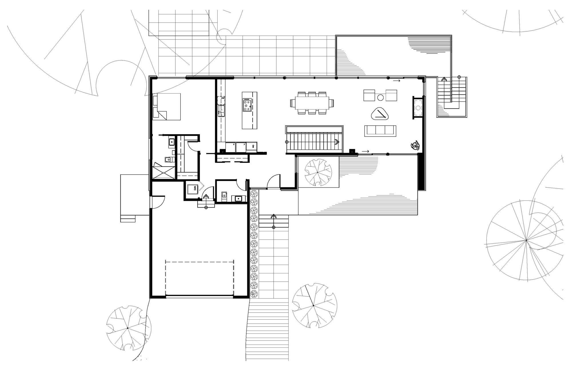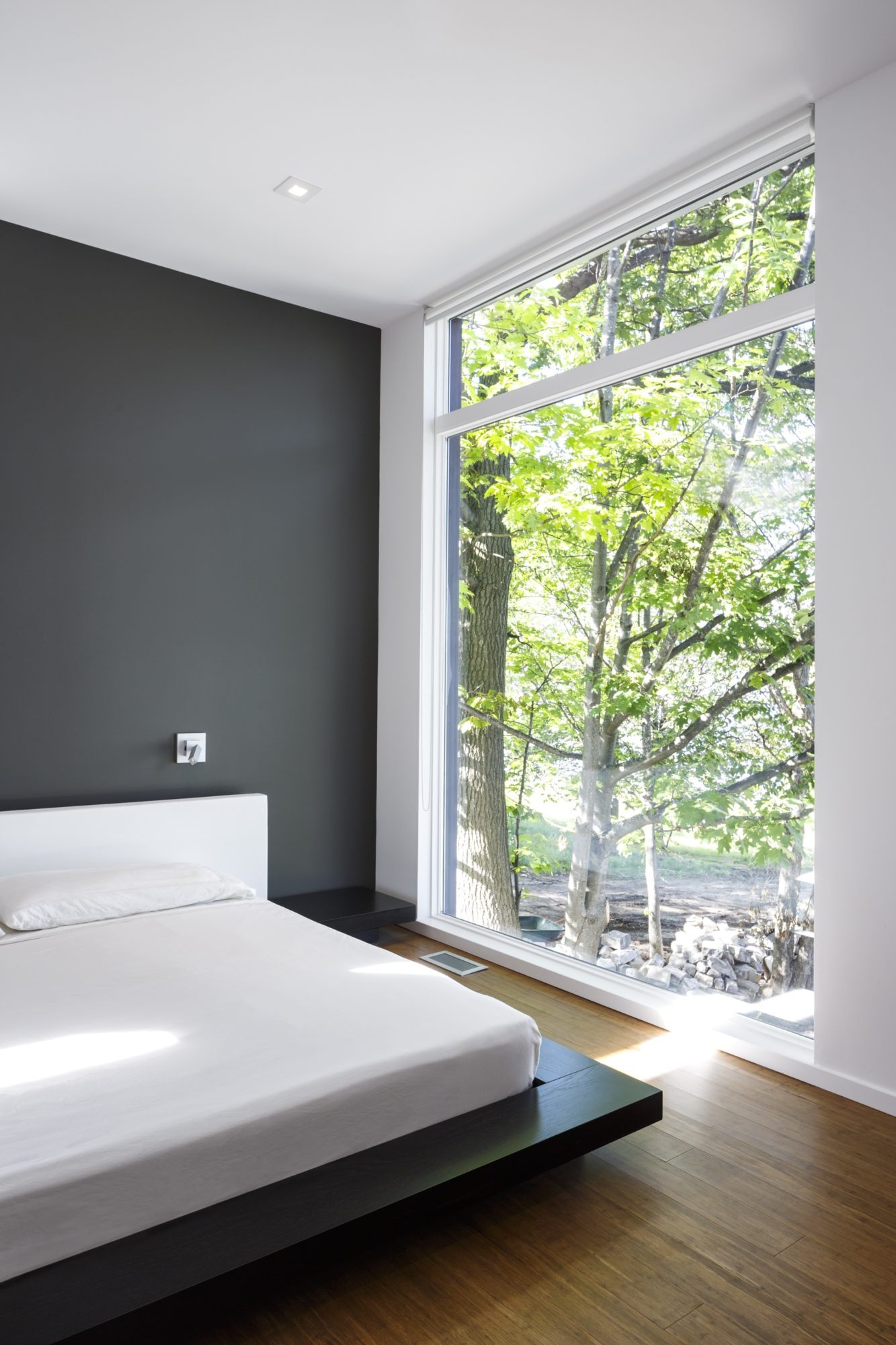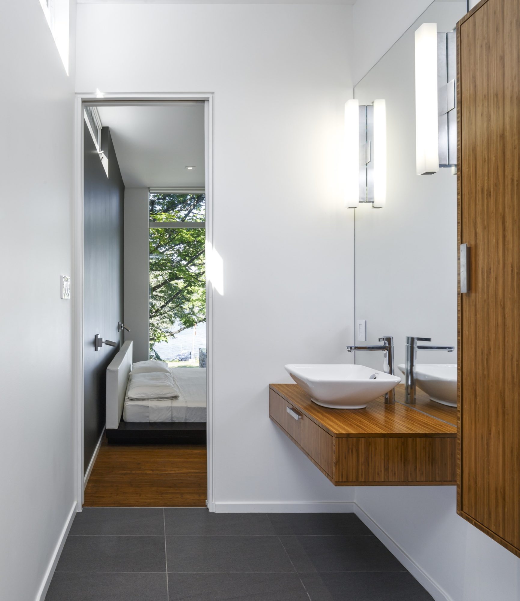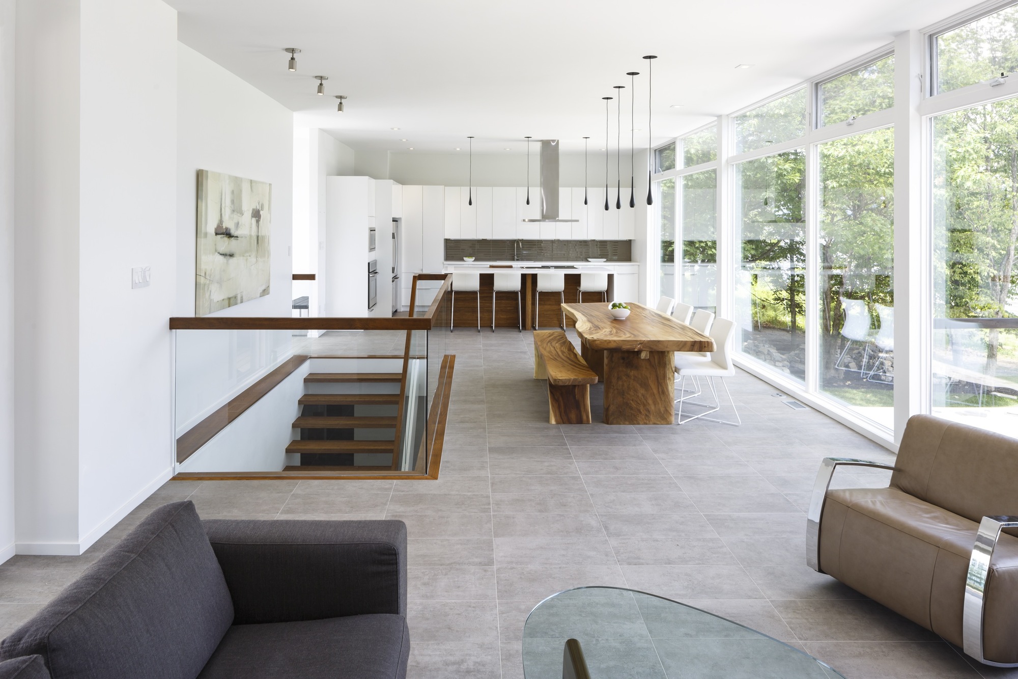 The juxtaposition of natural and industrial materials continues on the interior; bamboo stair treads complement polished concrete floors in the lower level. Bamboo flooring and cabinetry bring warmth to the master suite. The open-riser stair with its glass guard keeps the lower level family room feeling connected to the main living space.