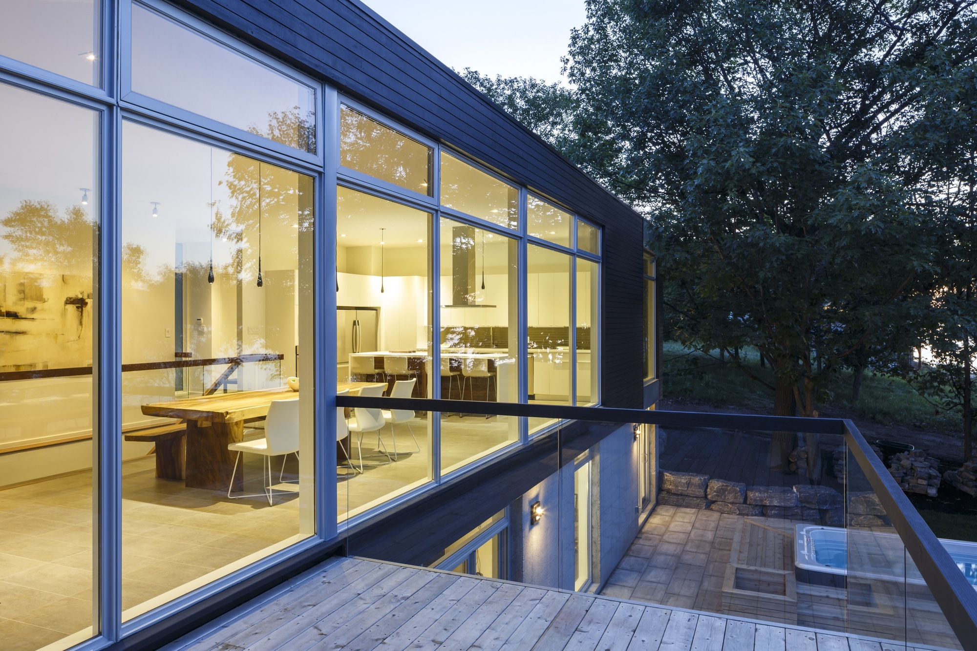 Simplicity and openness define the experience of being in this modest home. To the river, a continuous wall of glass spans the living, dining and kitchen space allowing a full panorama of the passing seasons.