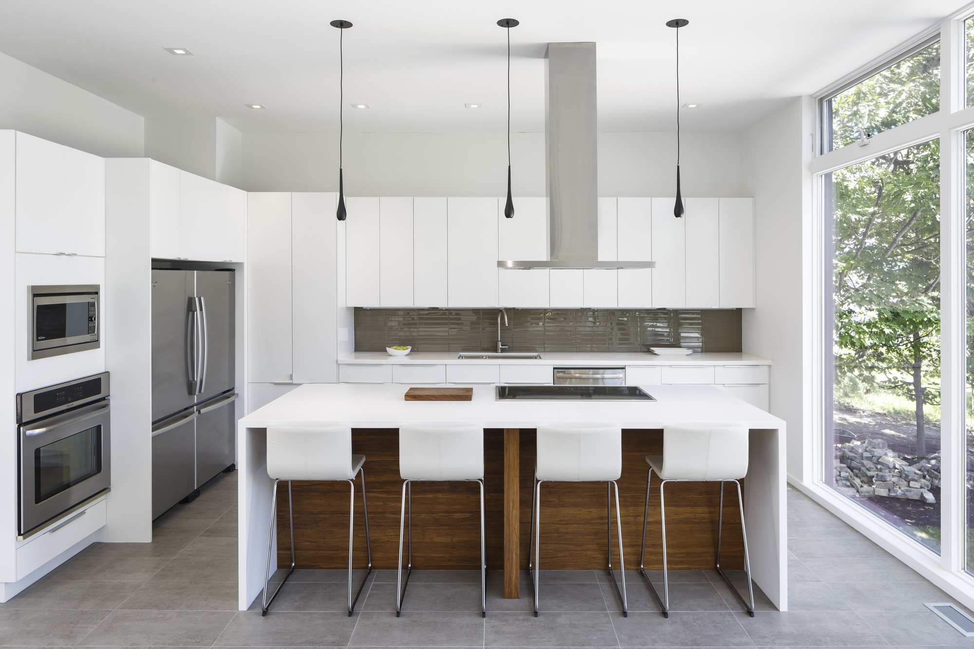 The materials that were used in the building process include a mix of natural and industrial elements such as bamboo for the stairs and polished concrete for the lower level floors. Furthermore, the floors and cabinetry in the master suite are made out of bamboo for a touch of warmth and elegance. Even though the kitchen was made on a budget, it performs and looks admirably with its high gloss cabinetry and glass tile backsplash.