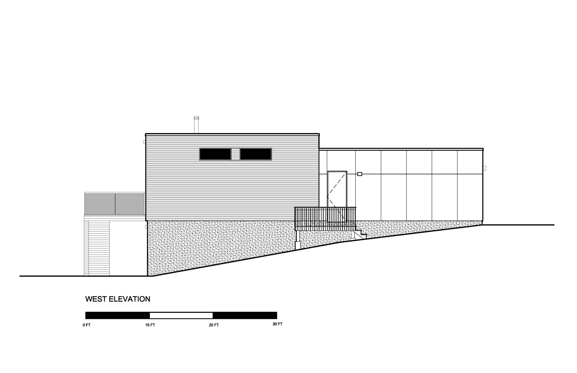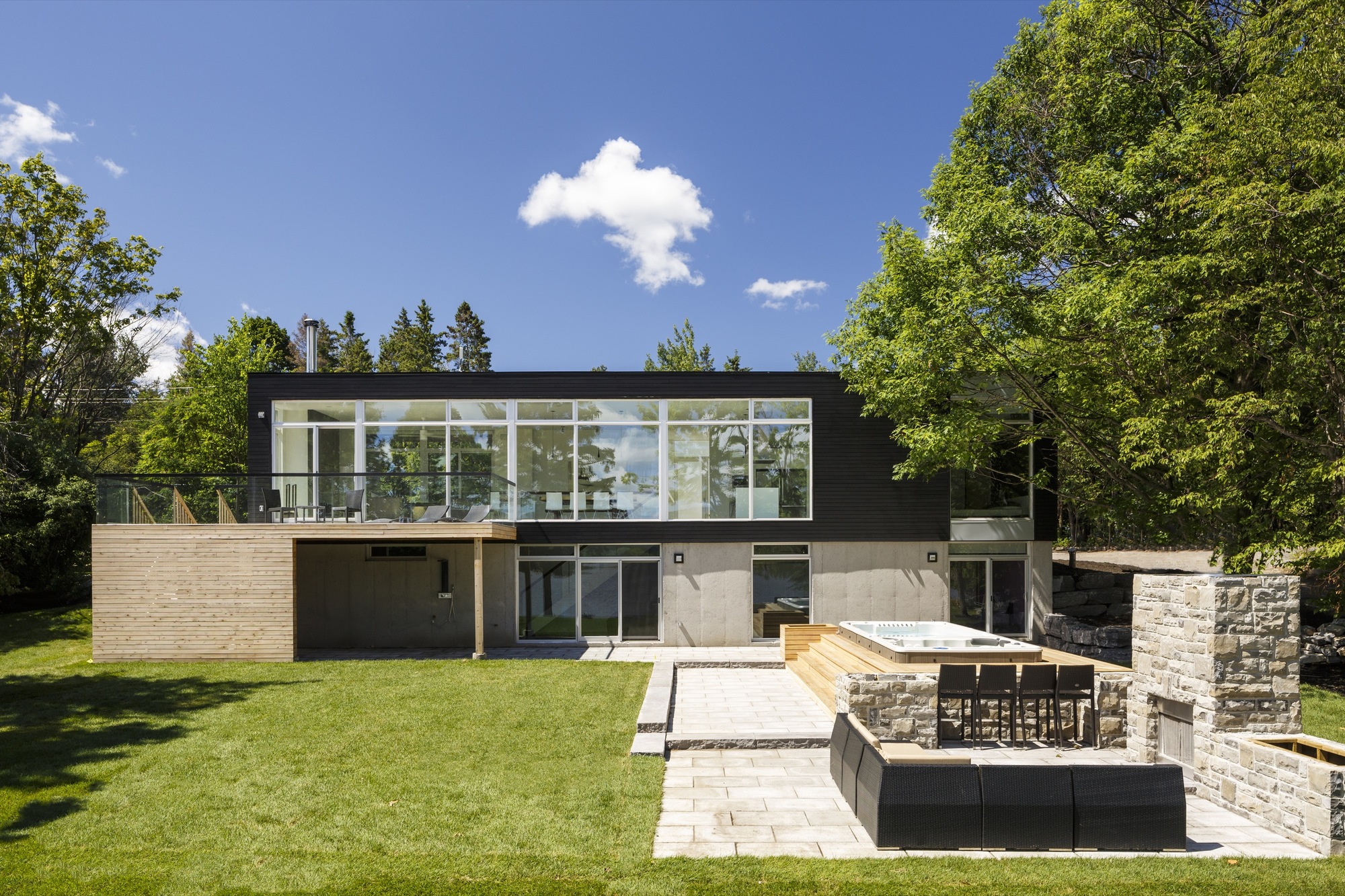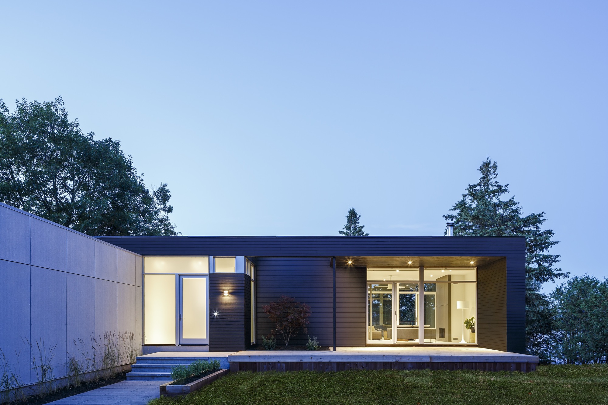 Away from the water the view is framed and edited by a simple porch. The porch roof has been opened to create space from nature, a single Japanese maple which is inserted as a foil to the simple black stained cedar cladding of the house. The garage volume is differentiated from the house by a cladding of grey cement board.