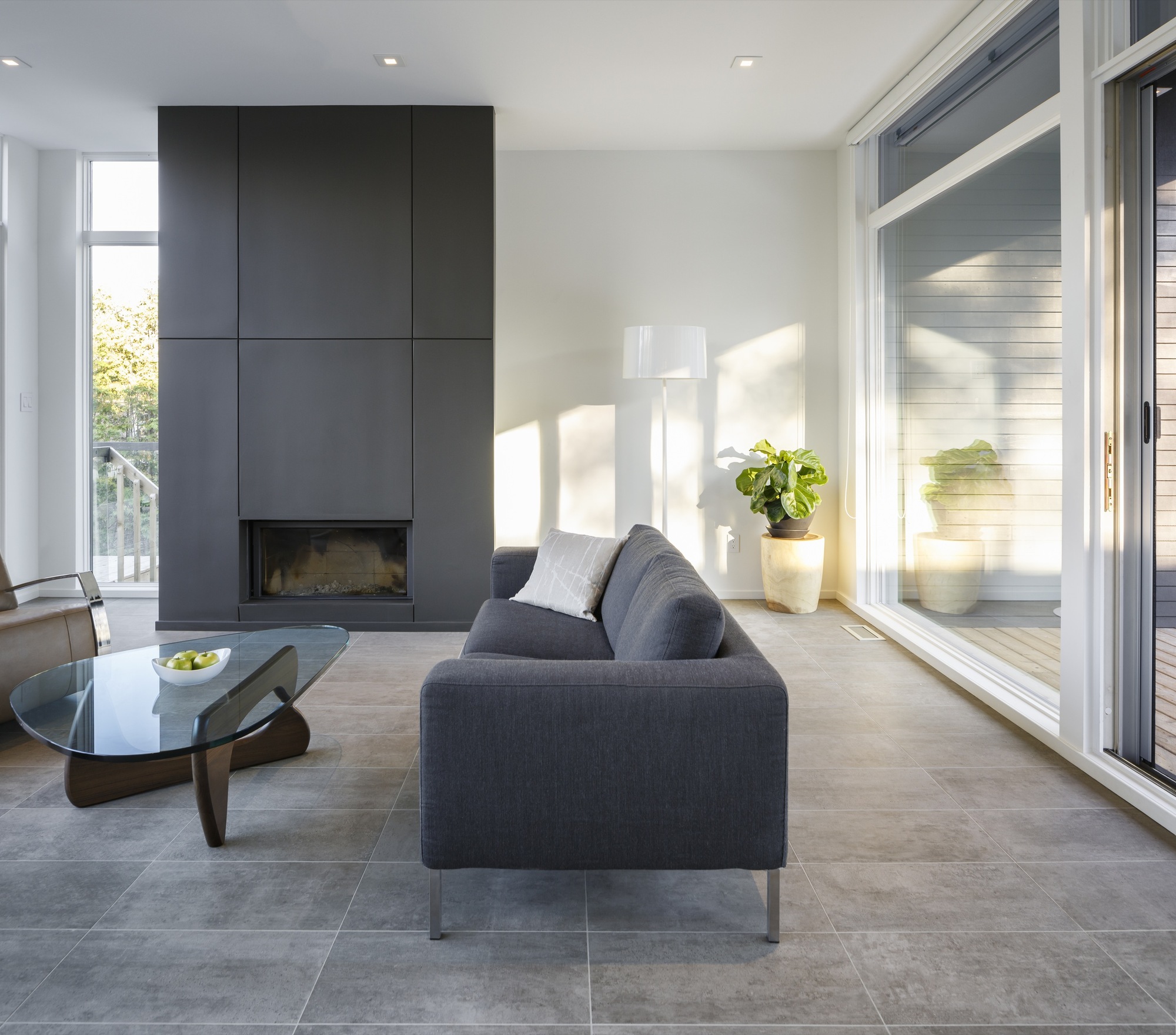 The living room is linked to an outdoor porch and features a fireplace, a comfortable sofa and a glass coffee table. Outside, the porch incorporates a beautiful Japanese maple tree and boasts an opening in its roof in order to allow it to grow freely.