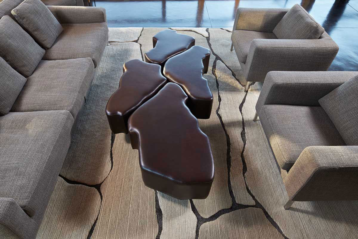To further emphasize the idea of lightness, the exposed wood structure of the living pavilion roof changes pitch along its length, so the roof warps upward at each end. The interior exposed wood beams appear like an unfolding fan as the roof pitch changes. The main interior bearing columns are steel with a tapered “V”-shape, recalling the lightness of a dancer.