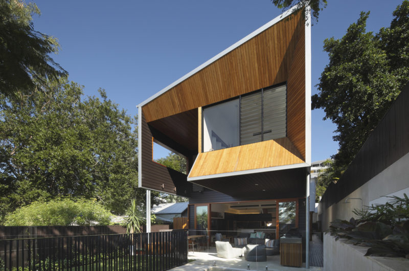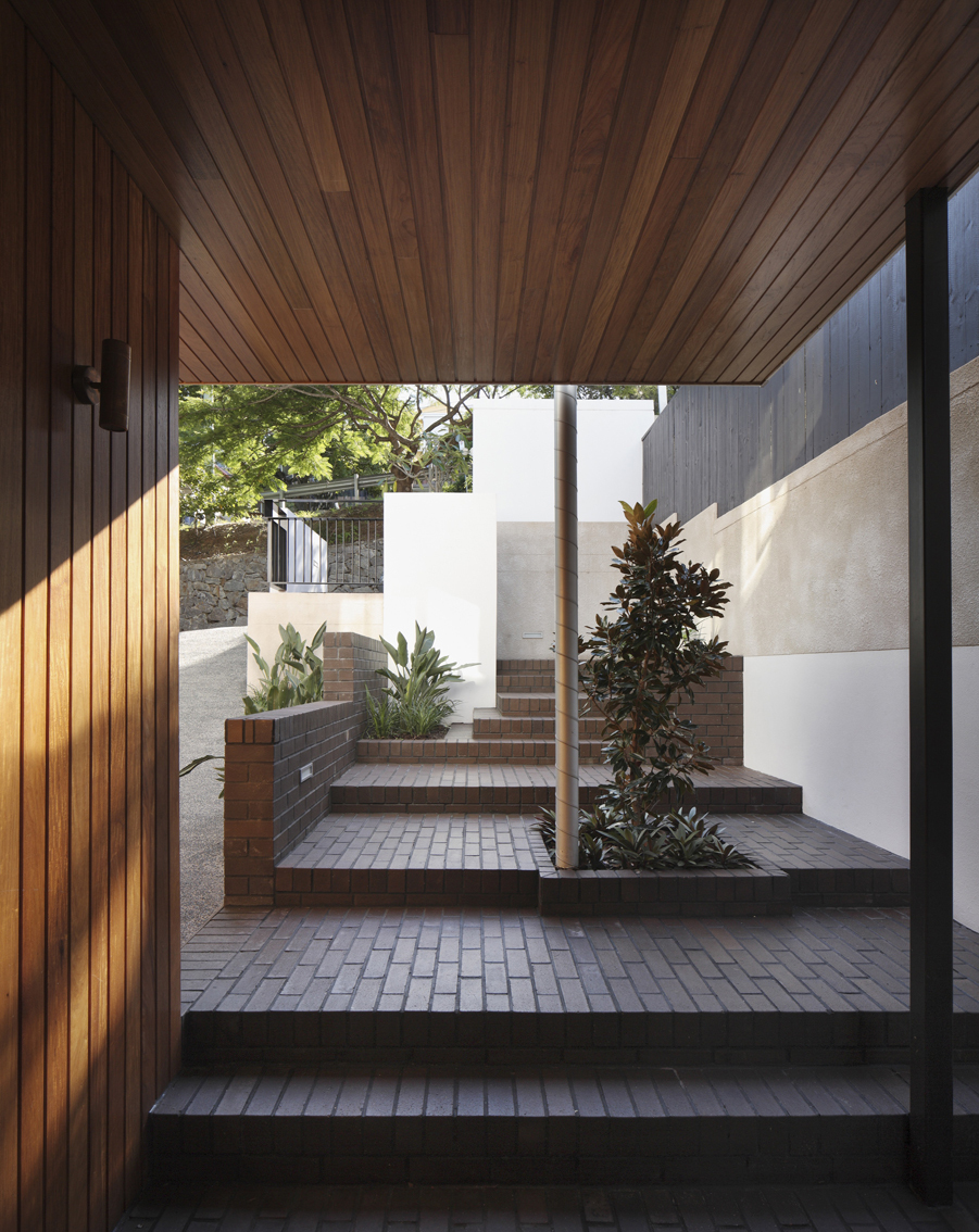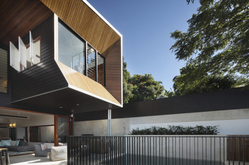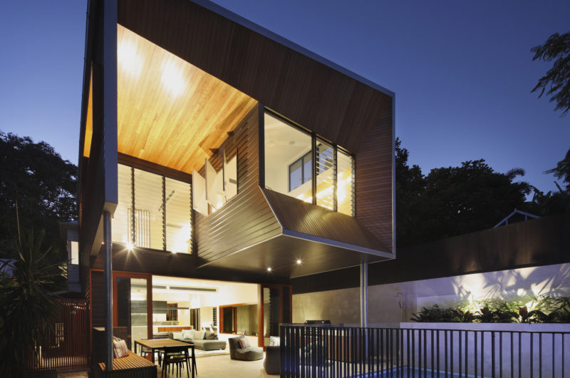 The construction’s double height outdoor living space frames the city views and connects to the garden and the pool.