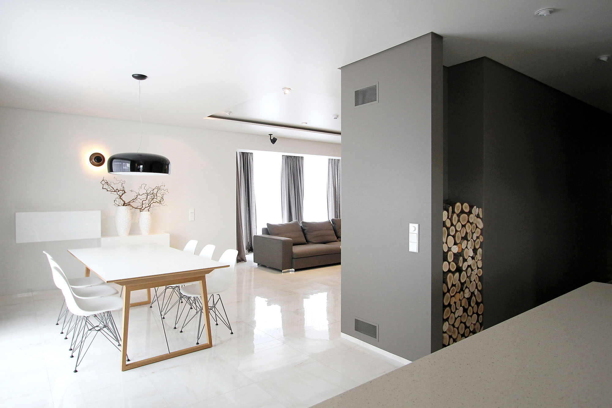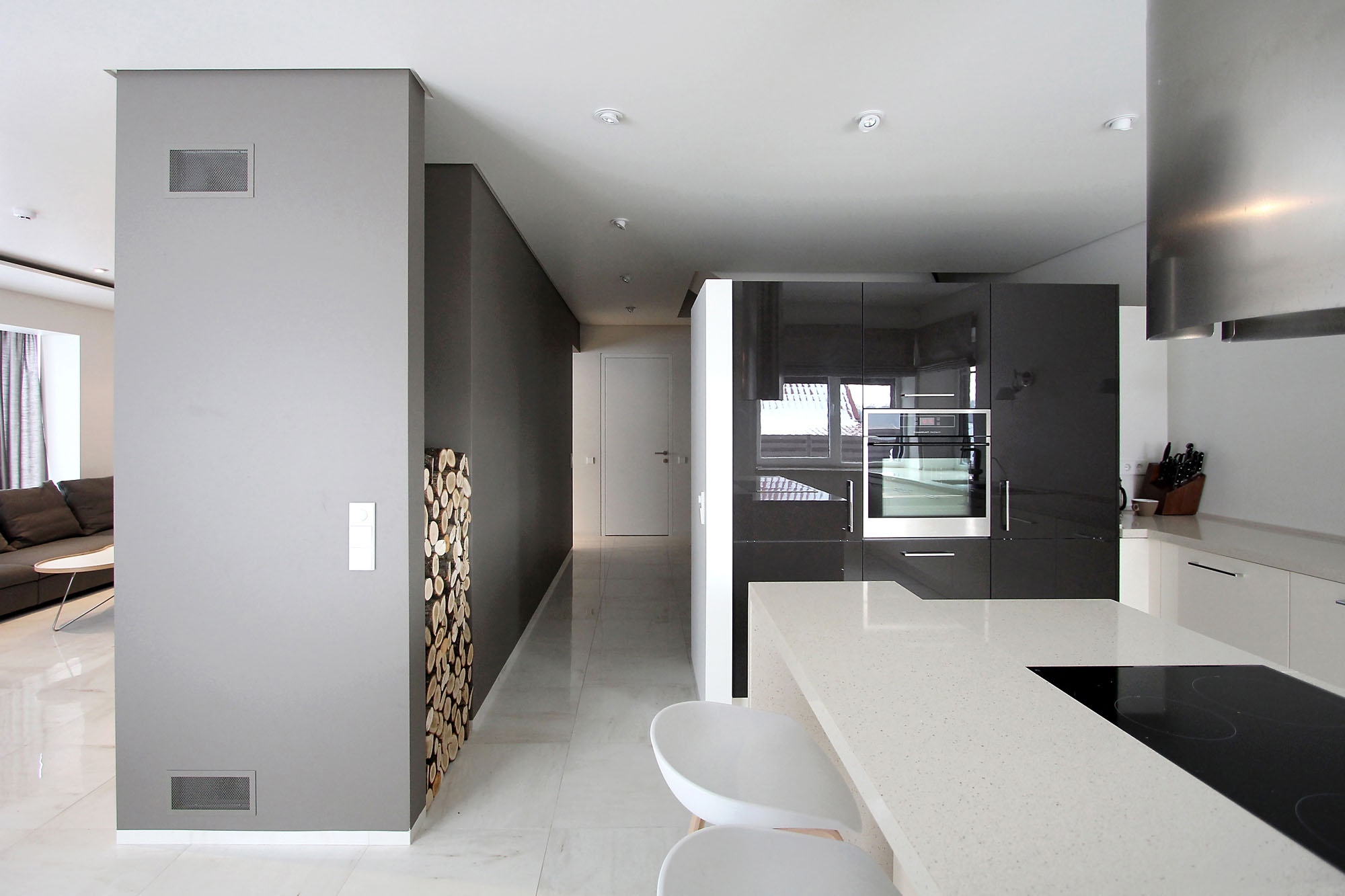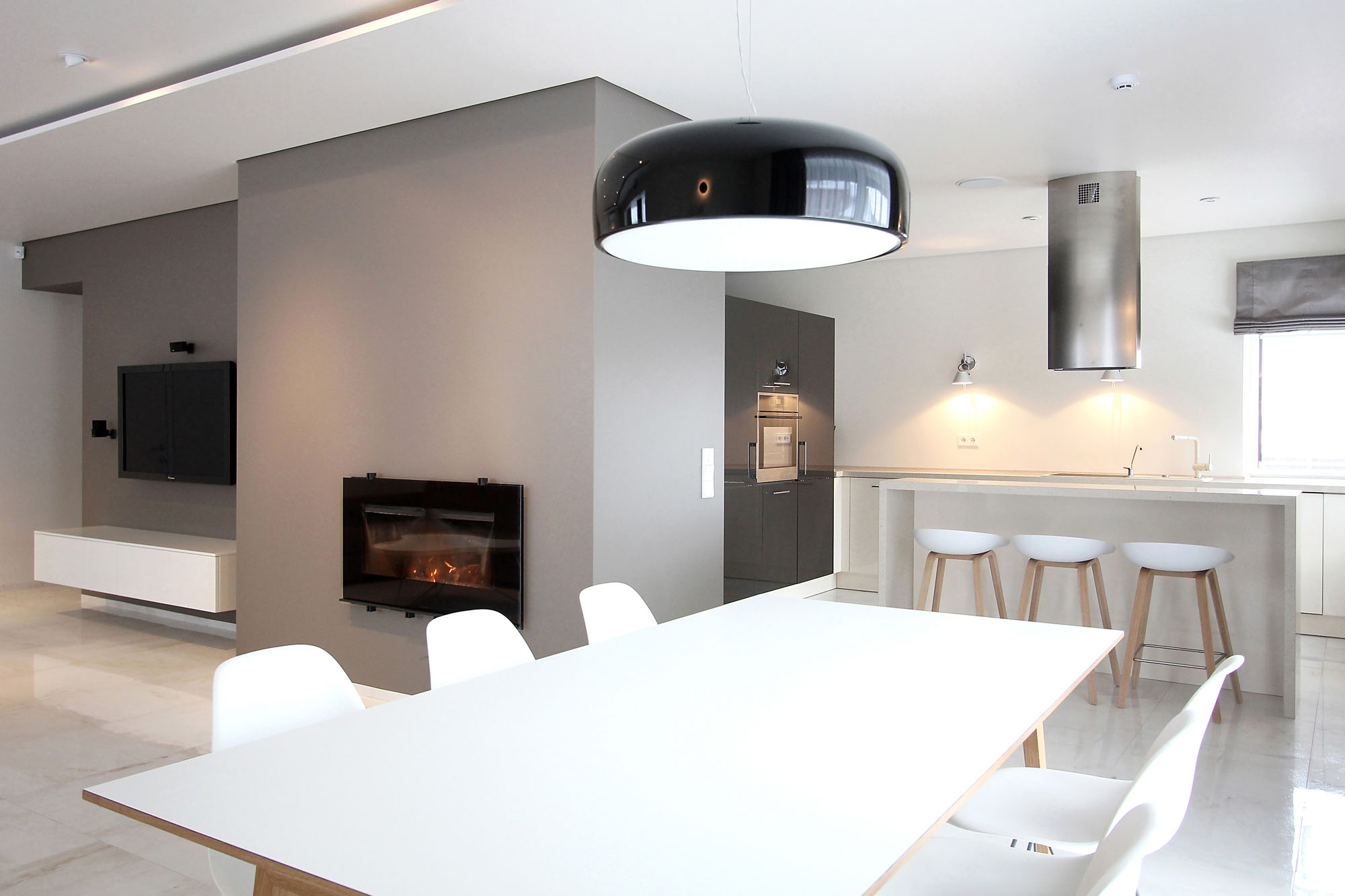 Minimal style and white colour is dominant in the interior of the house. It is combined with natural wood fittings and grey shades of walls and furniture.