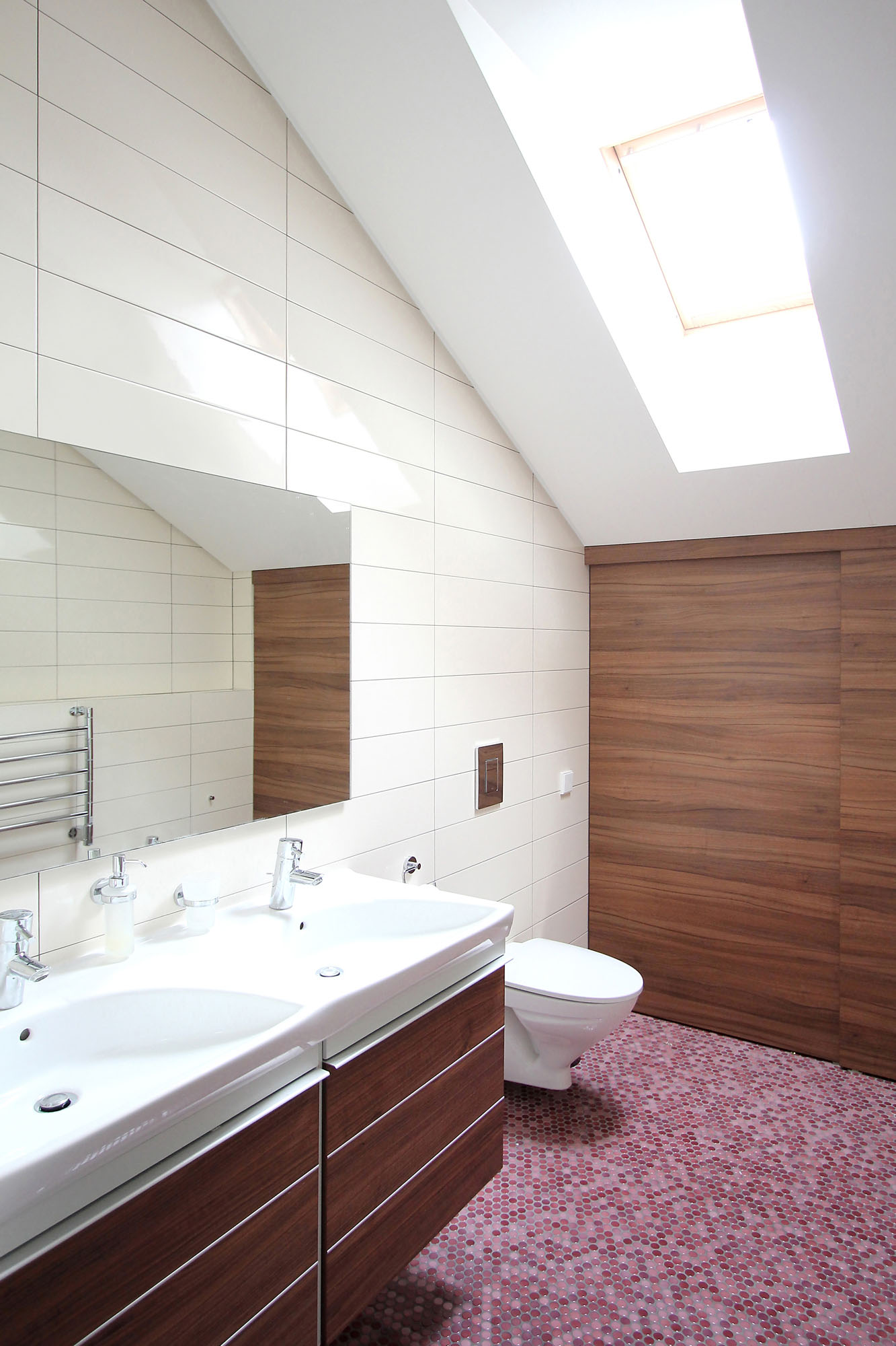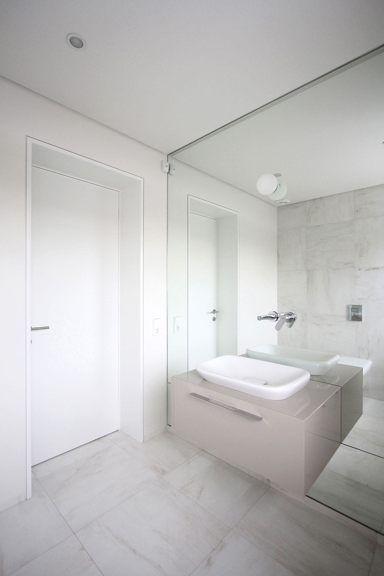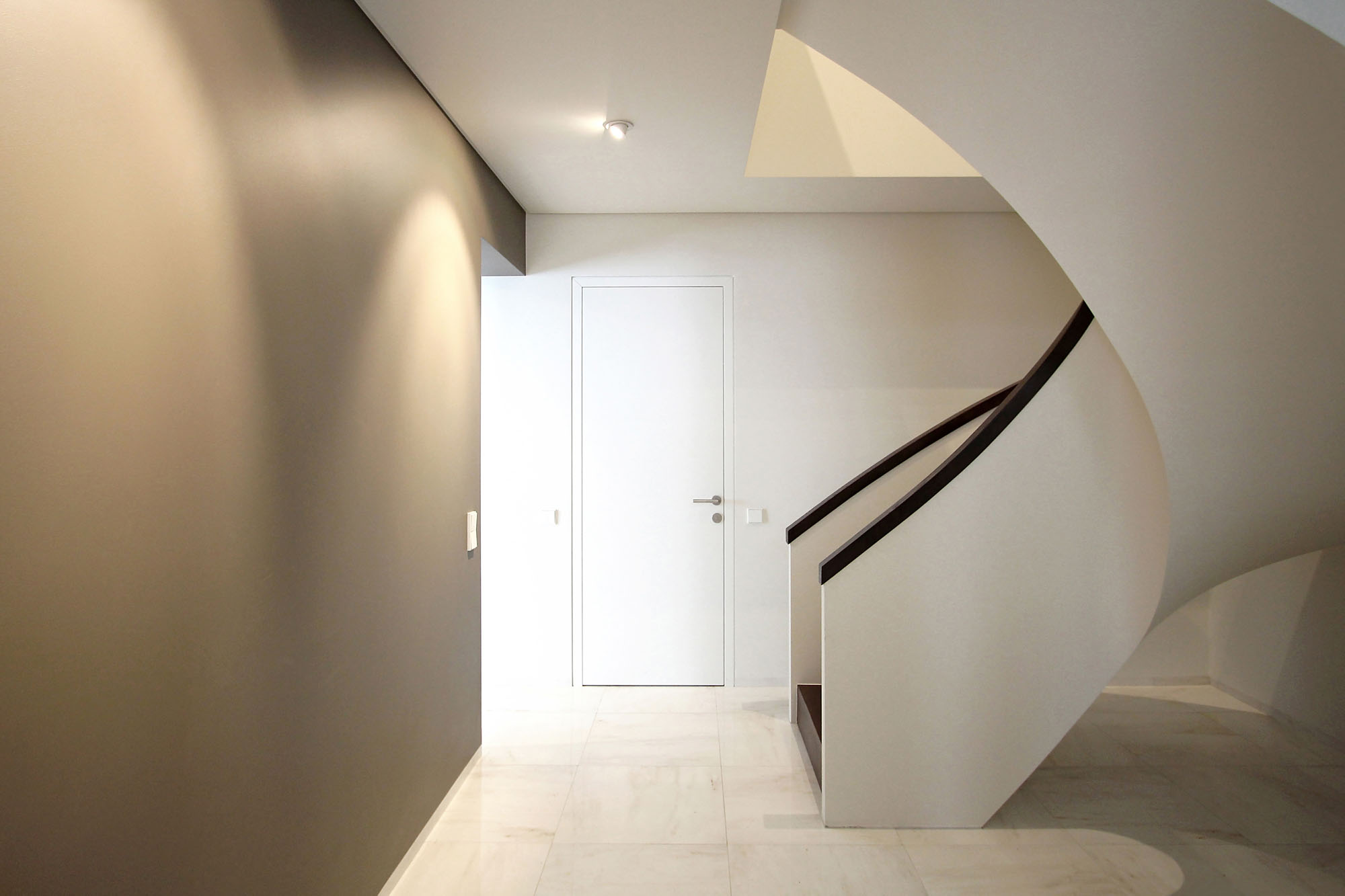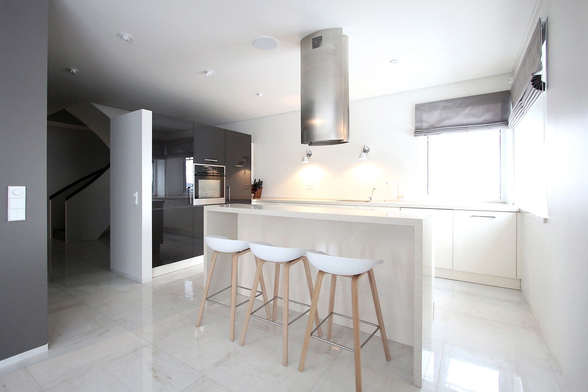 Minimal style and white colour is dominant in the interior of the house. It is combined with natural wood fittings and grey shades of walls and furniture.