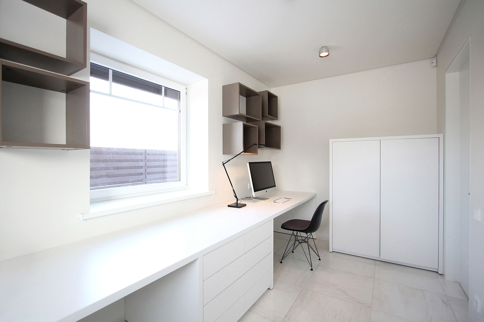 The second floor is now reachable via a newly installed staircase, which leads the way towards the bathrooms and bedrooms. Aside from the main living areas, the apartment also includes a small workspace with a white desk, a personal computer and a modern lamp. Even though white is the predominant color within the house, the designers also implemented wood features and gray elements on the walls for a touch of contrast.