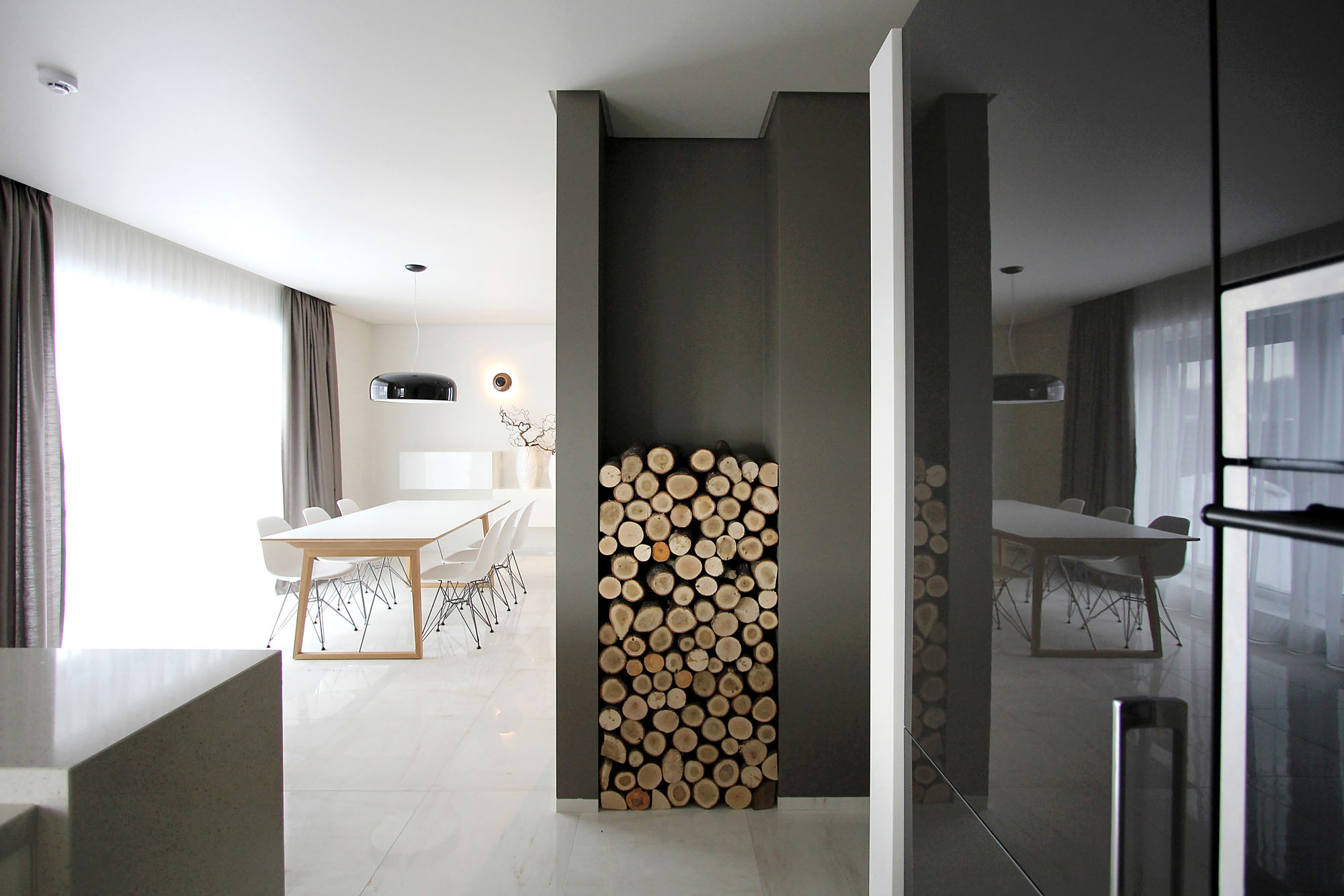 The minimalistic House 02 is the result of a successful renovation process carried out by designers Ramunas Manikas and Valdas Kontrimas. The residence features 2,690 square feet of space and is located within a beautiful Lithuanian city named Klaipeda. The main modifications were focused on the first level, which incorporates the dining area, the kitchen and the living room. These three spaces were merged into a single open space that boasts a round wall with a fireplace at its center.