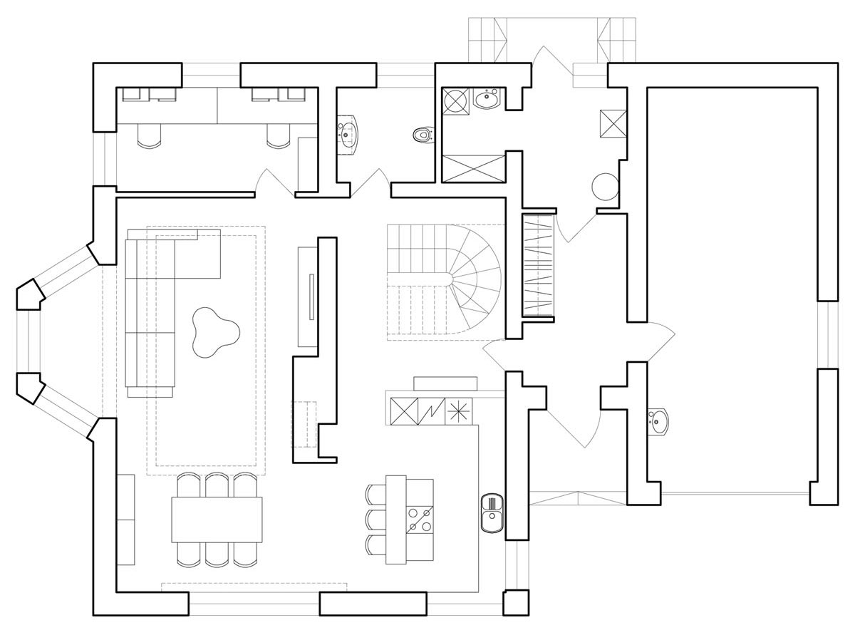 The rooms were united into one common area with a round wall with the fireplace installed in the middle of it. New stairs to the second floor were as well designed.