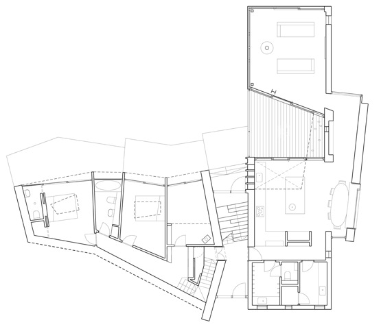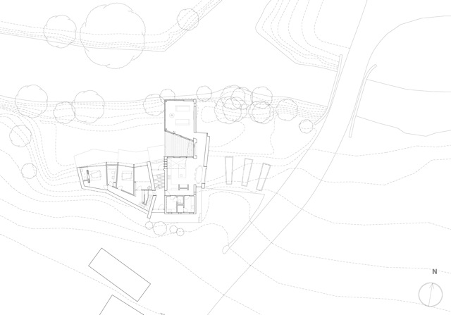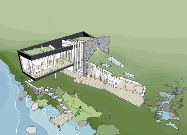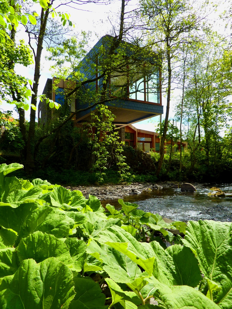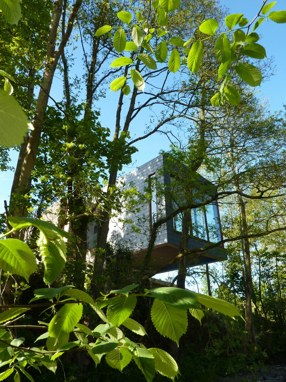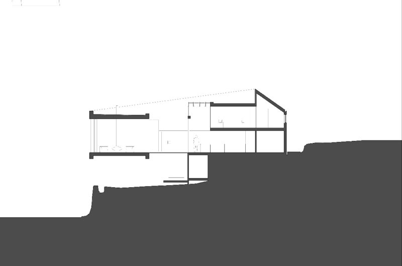 Two wings compose this cantilevered house that seems to rise from the sloping ground. The wing that includes the two guest bedrooms, a study room and has the view over the riverside deck is perpendicular to the main wing. The garden extends over the roof of this perpendicular wing, while the main wing includes the living and dining rooms, kitchen, two bedrooms and bathrooms.