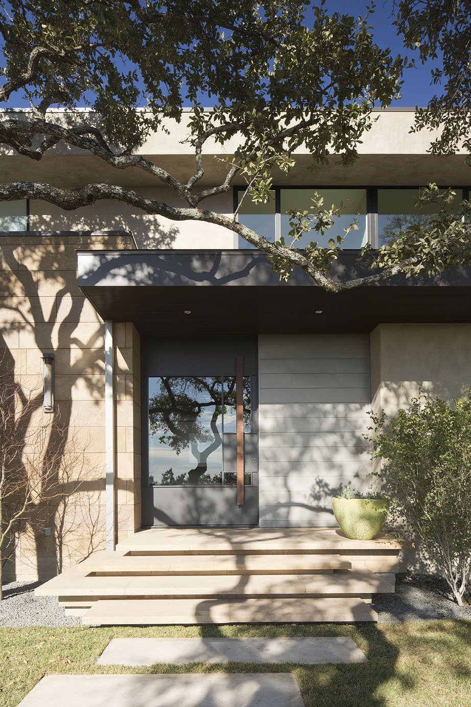 The exterior was finished by combining stucco, stone and zinc which provide the natural aspect. The interior was complemented by grey porcelain tile floors and black walnut built-ins.