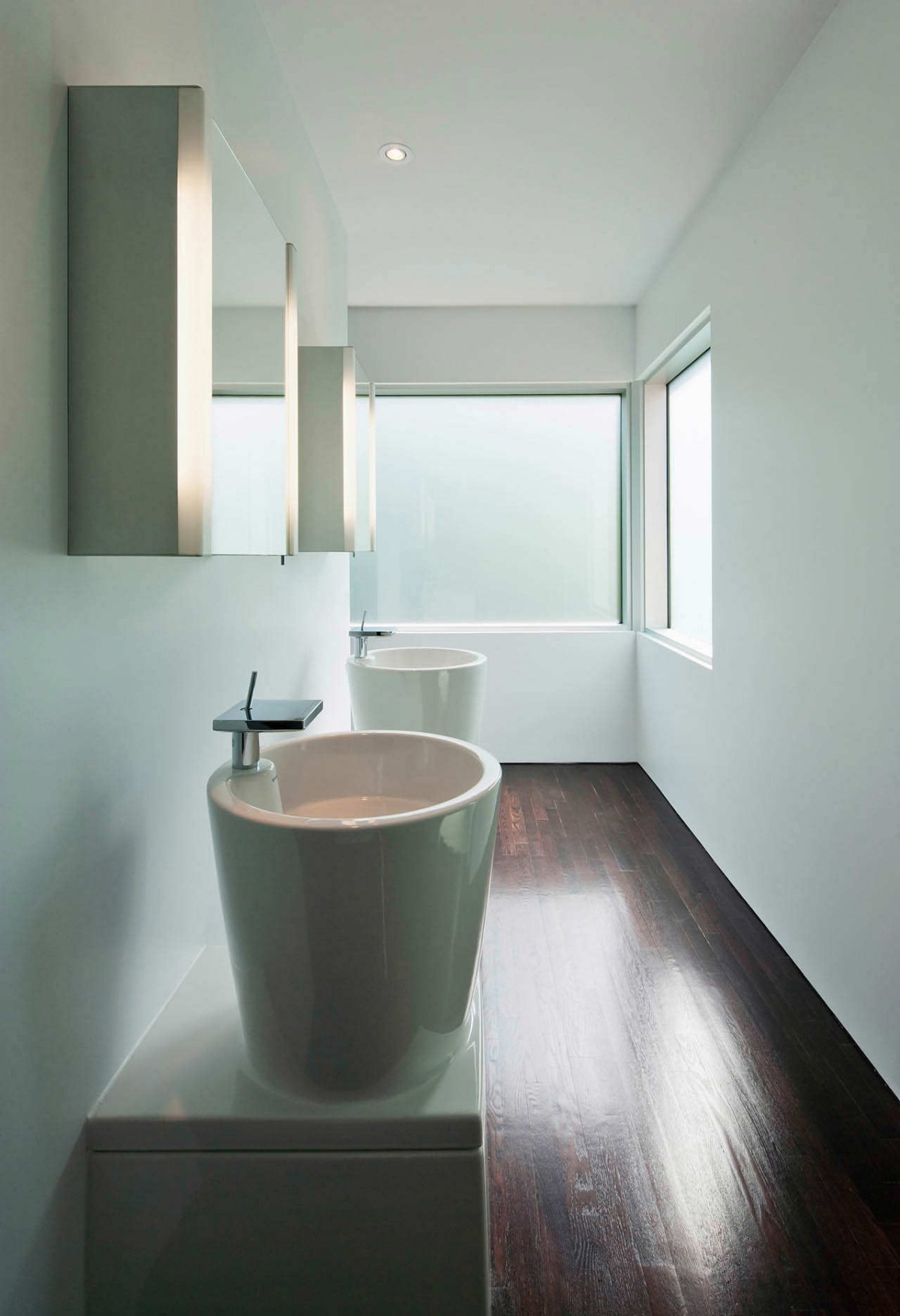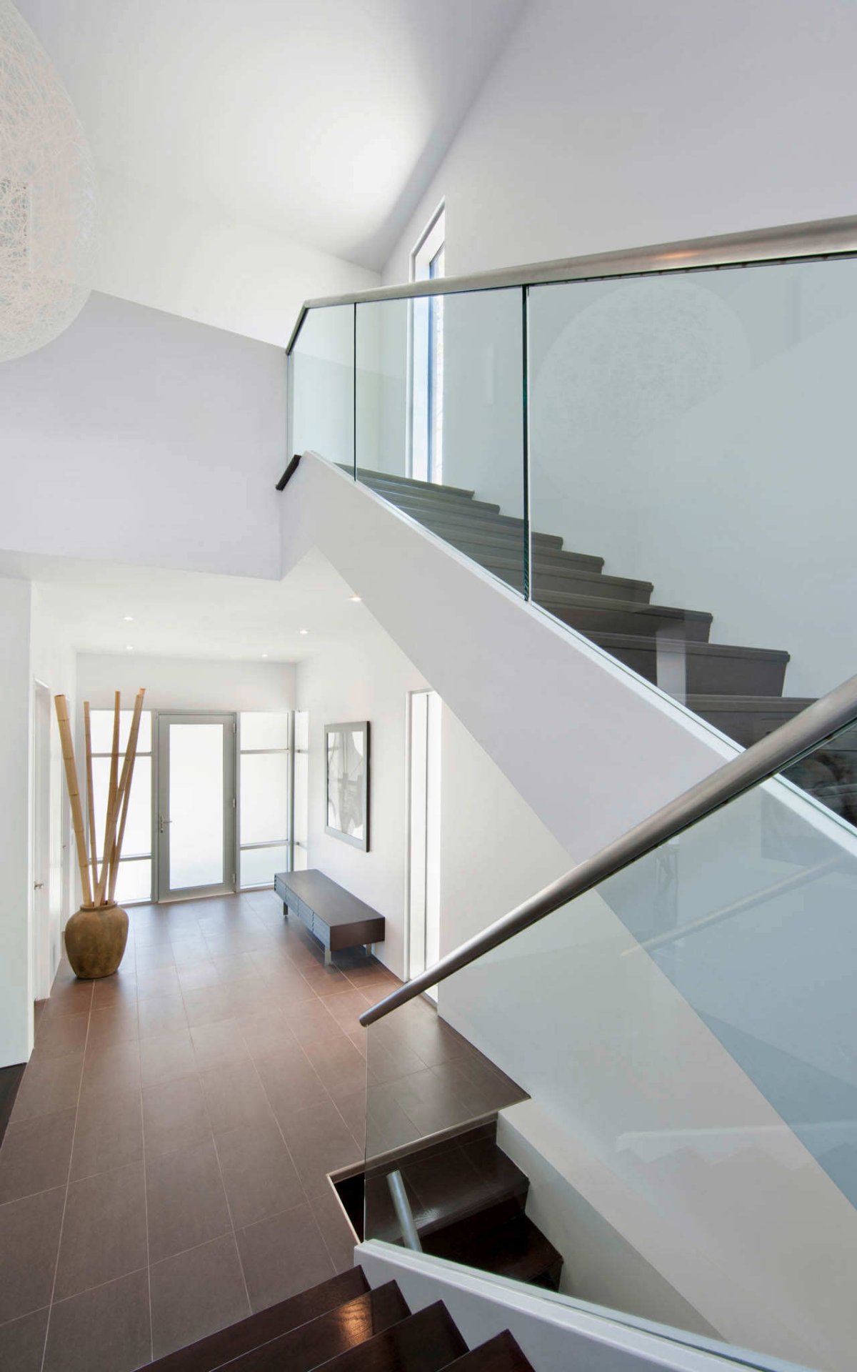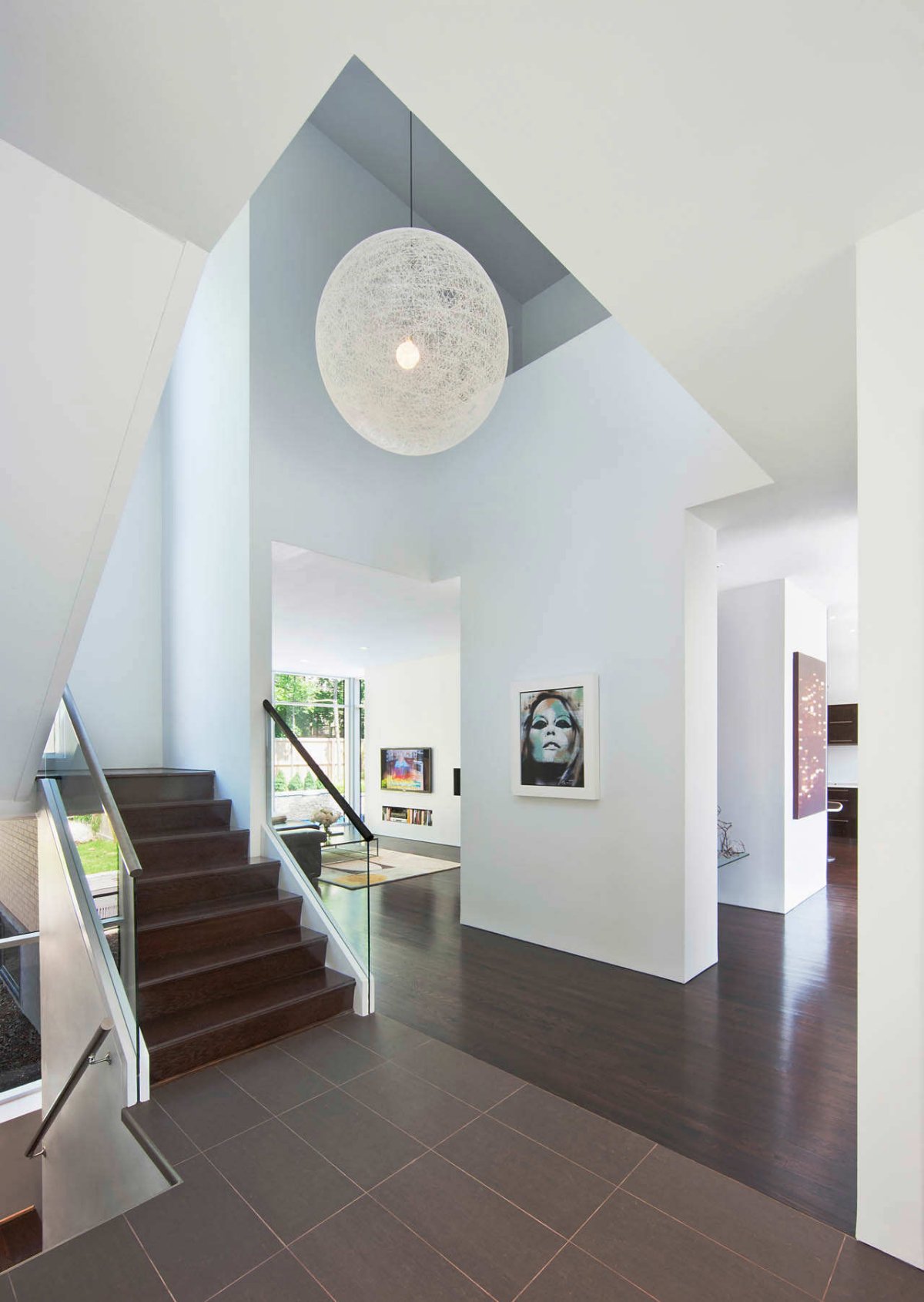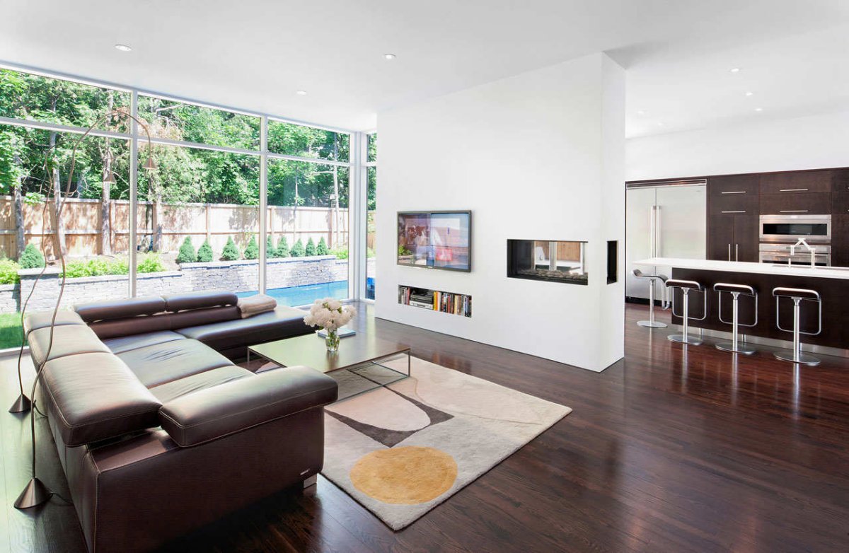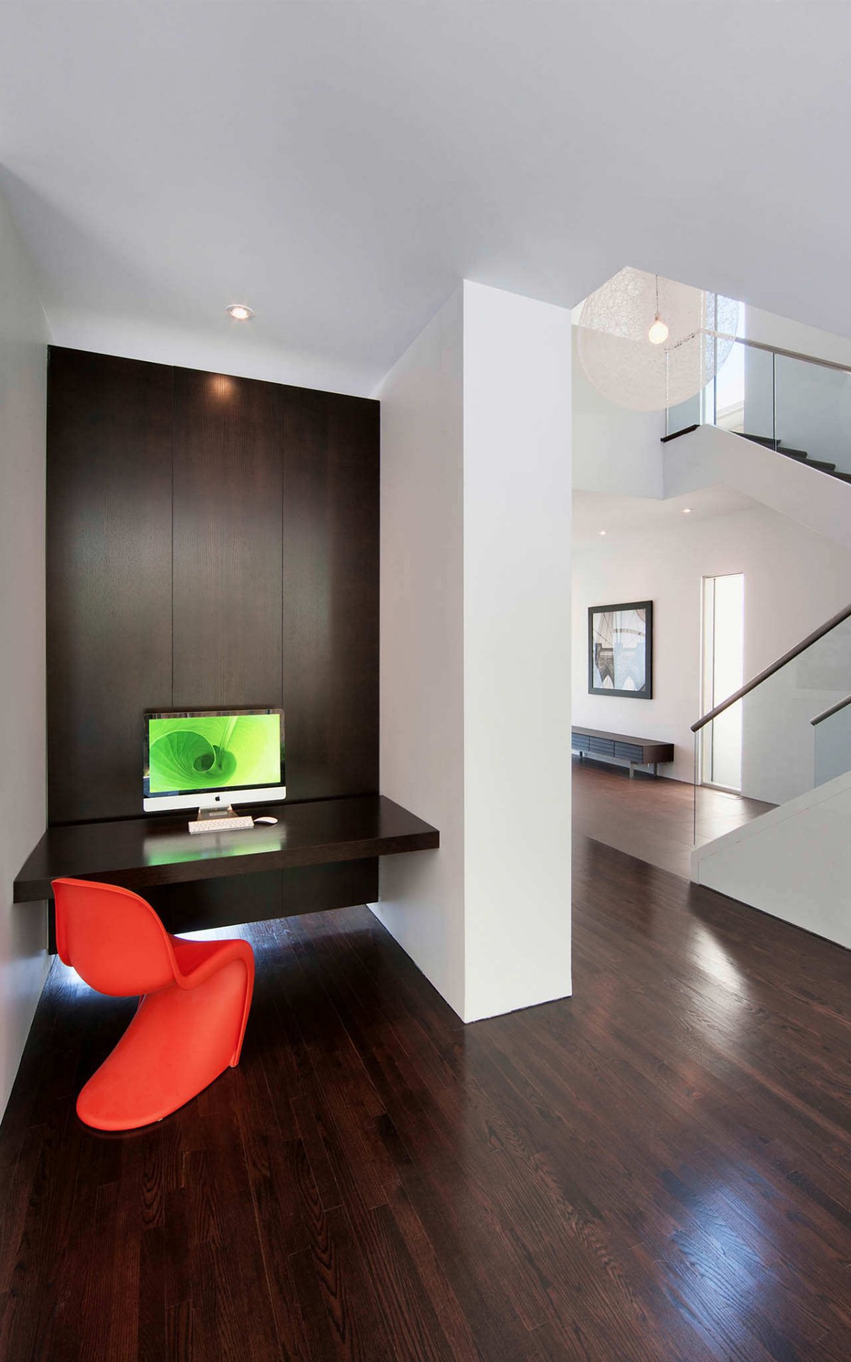 A simple white-based interior design gives this home the elegance it needs for simple living or for a great social life. The white walls dominate the inside color palette, but it is softened by the dark wood flooring and glass staircase.