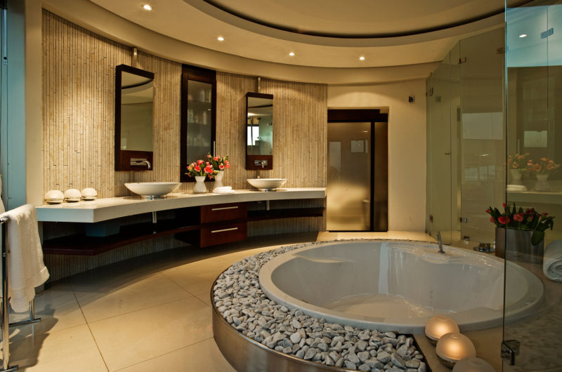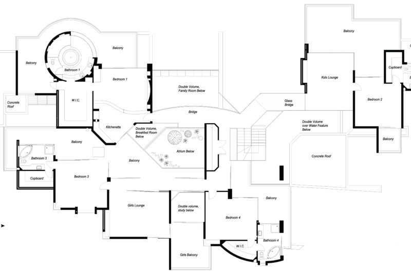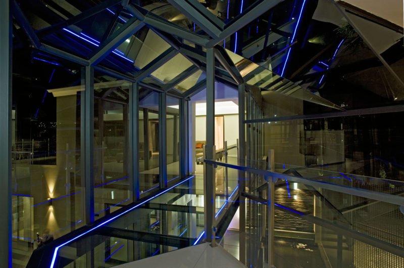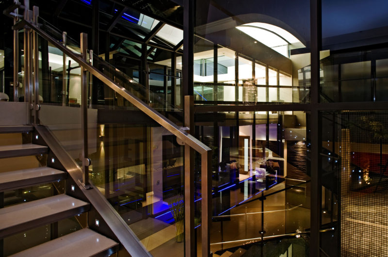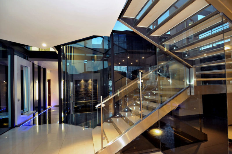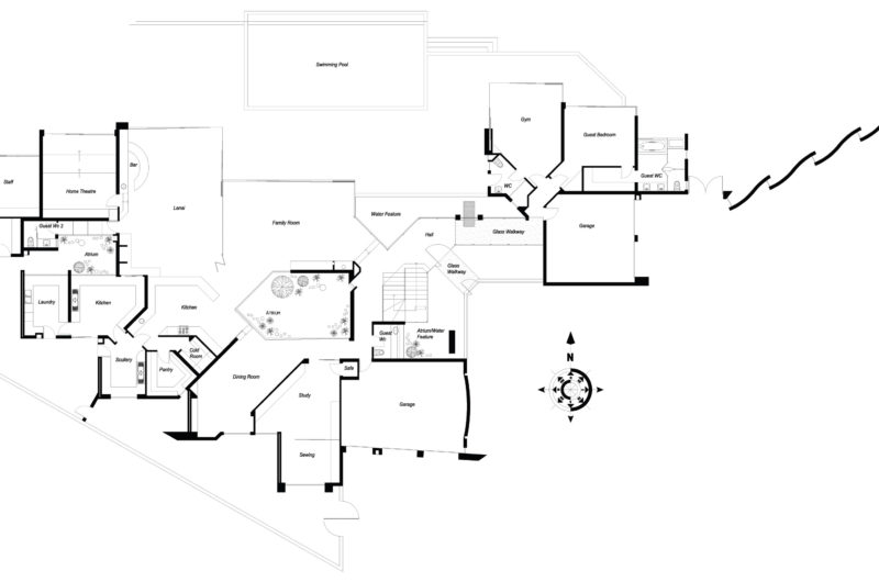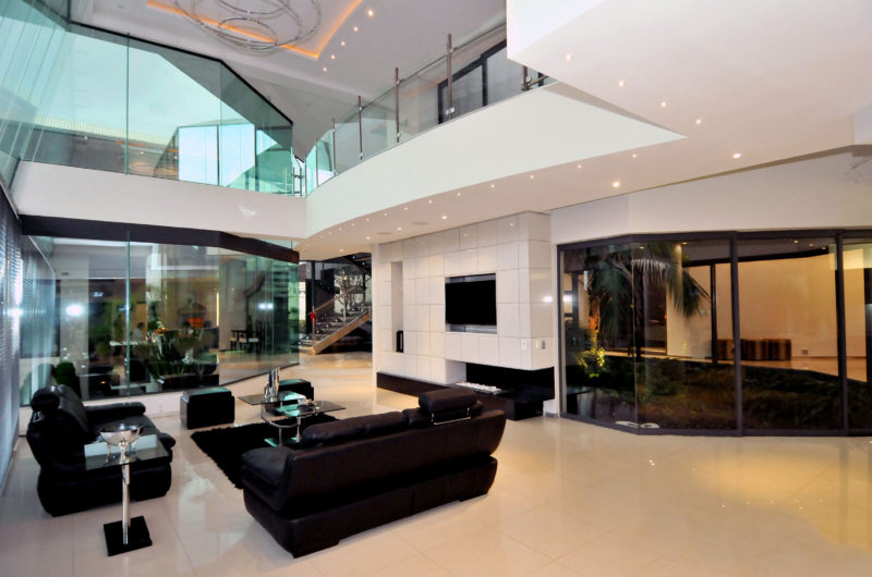 The guest wing accommodates a gym, a guest suite, a double garage, a lounge and a suite. The contemporary style can be found inside thanks to the light-filled areas, the connection between the indoor and the outdoor space, the bar, the family areas, the pool or the internal atrium.
