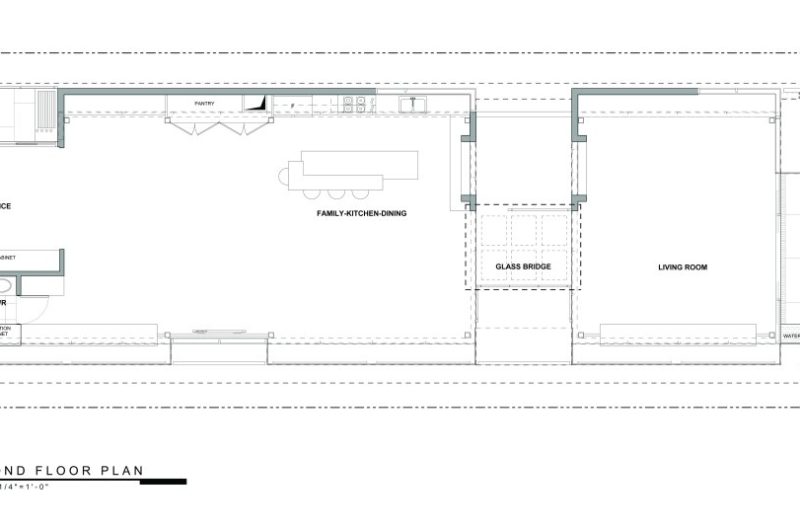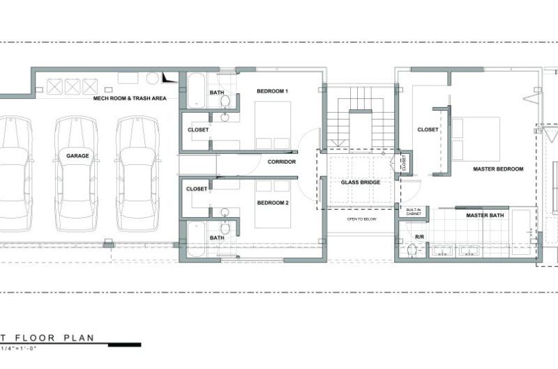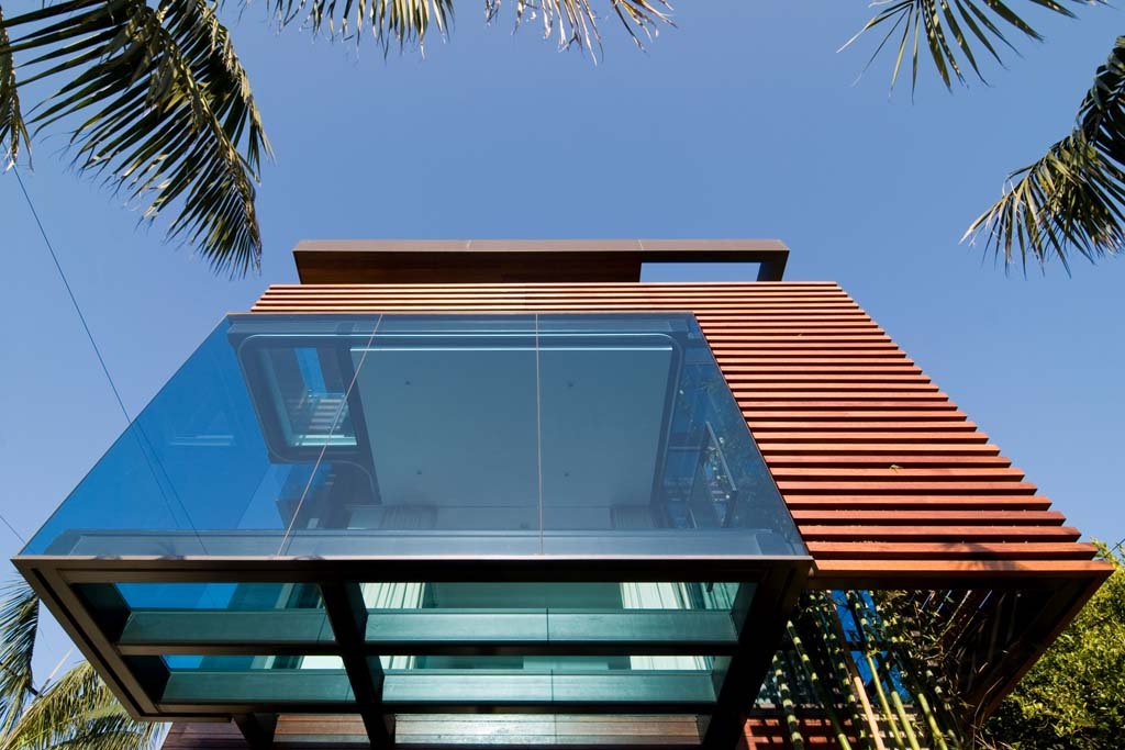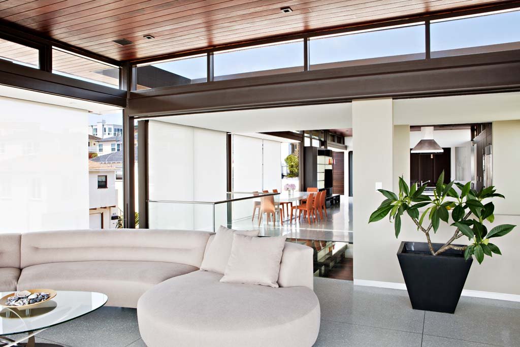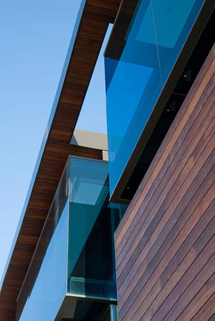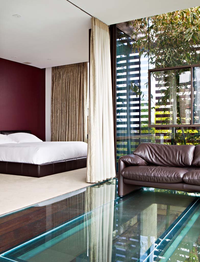 The mid level front of the house accommodates the master suite which, because of the glass floor, overlooks the reflecting pond and the garden.