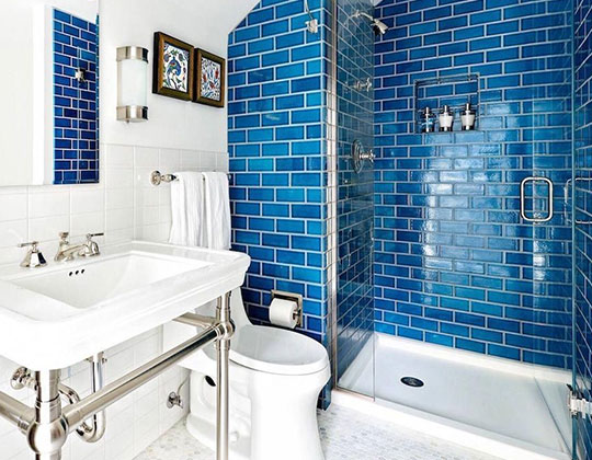 Your bathroom can be a cubicle size where you don’t have the luxury of free space. The compact area fits in an elegant white tub against the brick-style shower and light blue walls. On one side, you can have a solid, shiny black vanity where your clear glass rounded basin can sit aesthetically. All these can create an illusion of extended space as the countertop remains empty after adding this sink. The reflective properties of aluminium plates can make a small space feel larger.