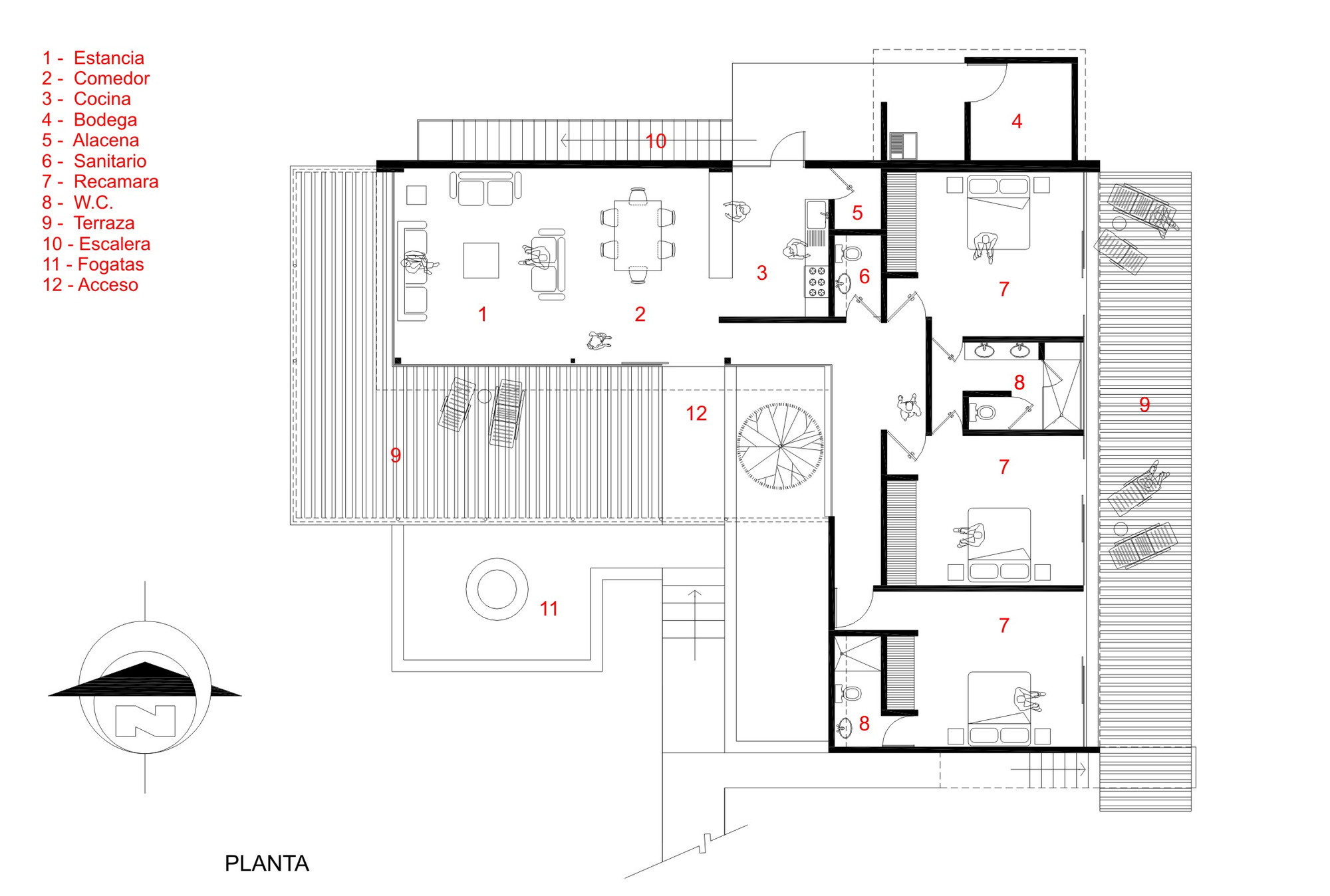 Taking advantage of the natural slope of the land, the house is located in the highest part, favoring spectacular views. The access to the house is determined based on platforms and stairways creating a path that connects the different exterior spaces of the house: a place for social events, an area for campfires and terraces for the public area and intimate area.