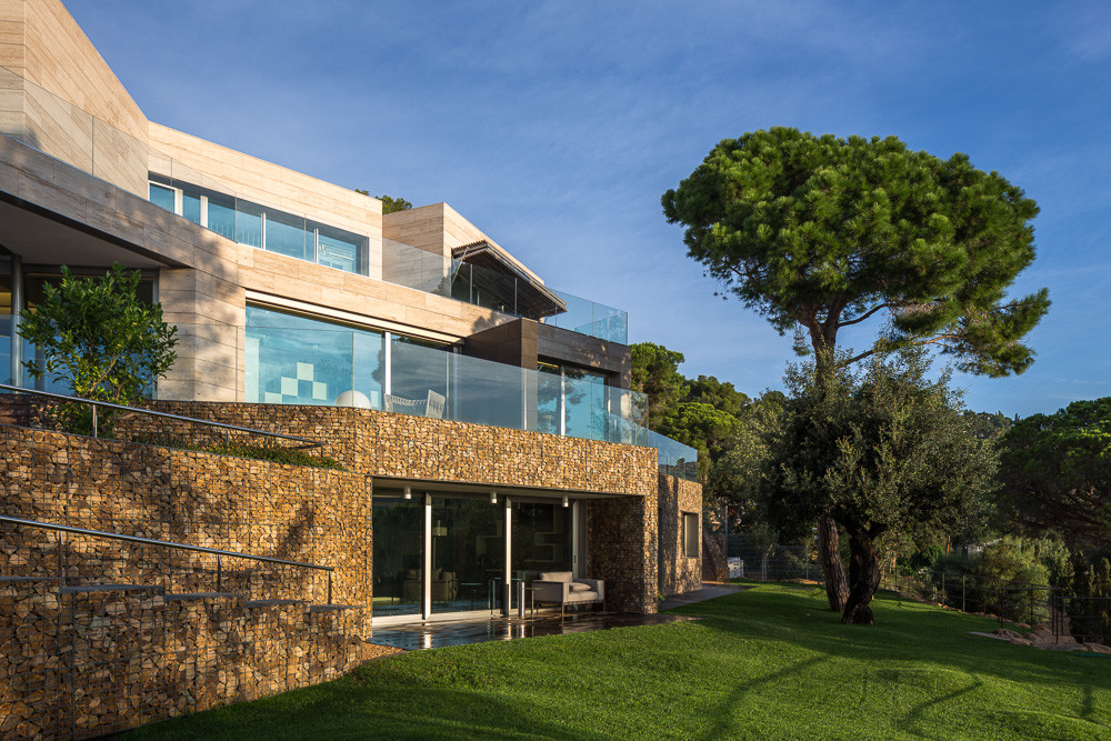The facades were created using two main materials, namely travertine stone for the upper volumes and locally sourced stones for the basement and garden walls.