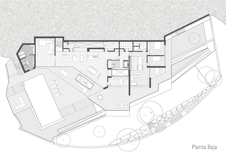 Ground floor that is the main level is situating the most important used pieces in open and direct connection with the outside terraces, swimming-pool and gardens. Three patios help to increase natural lighting and ventilation of this level. Also the serve to distribute the uses of the different spaces: guest apartment, main entrance and study, or the kitchen area and main living room.