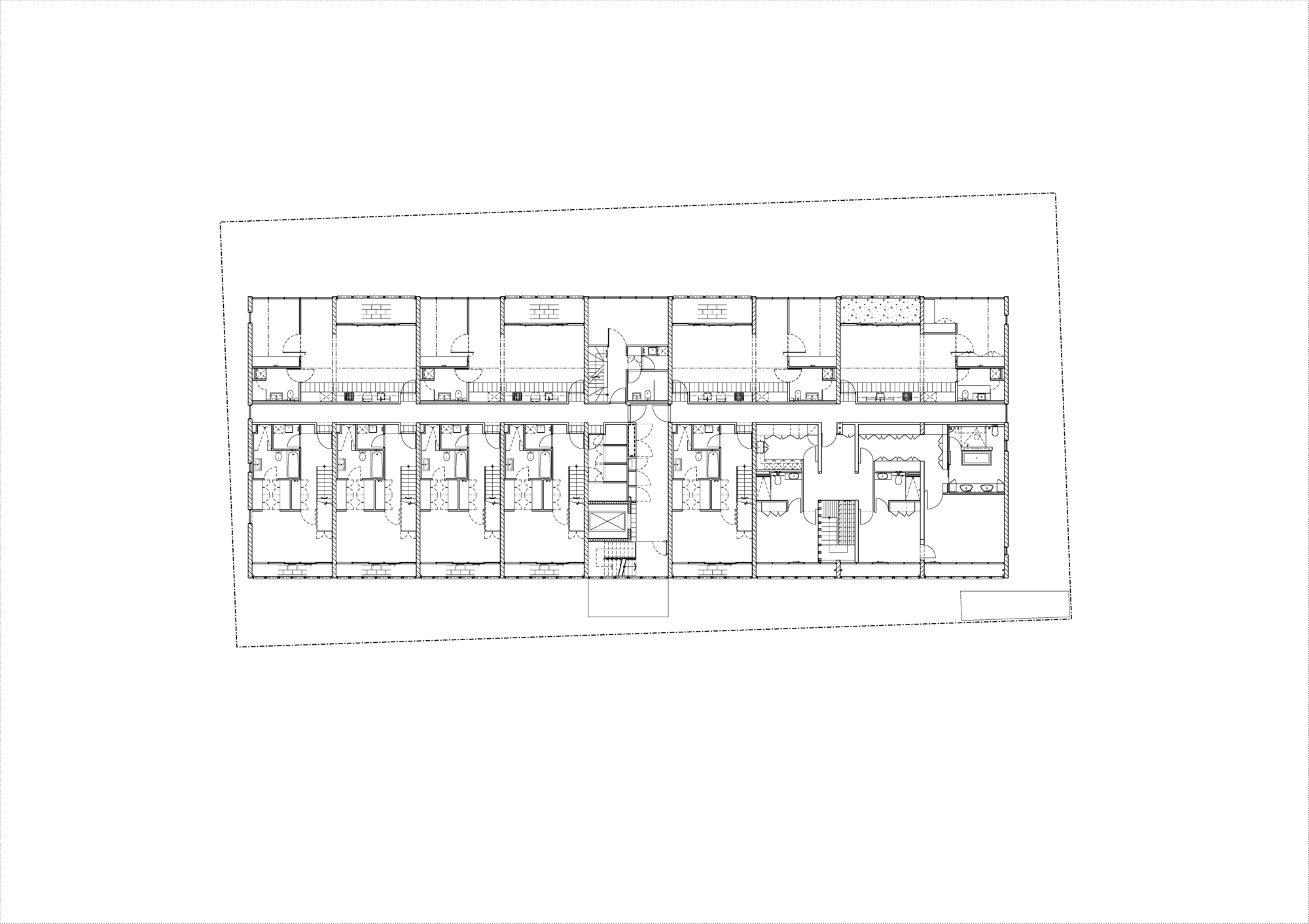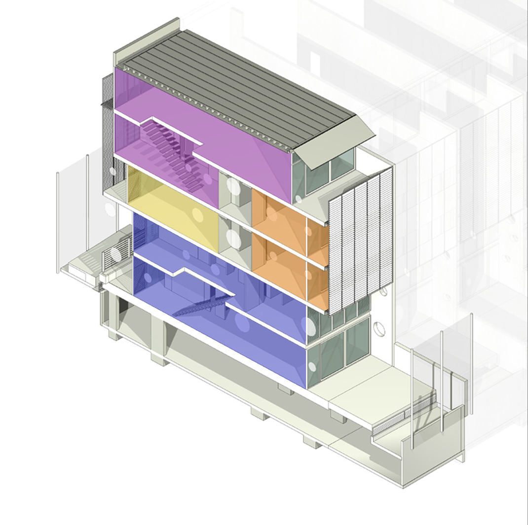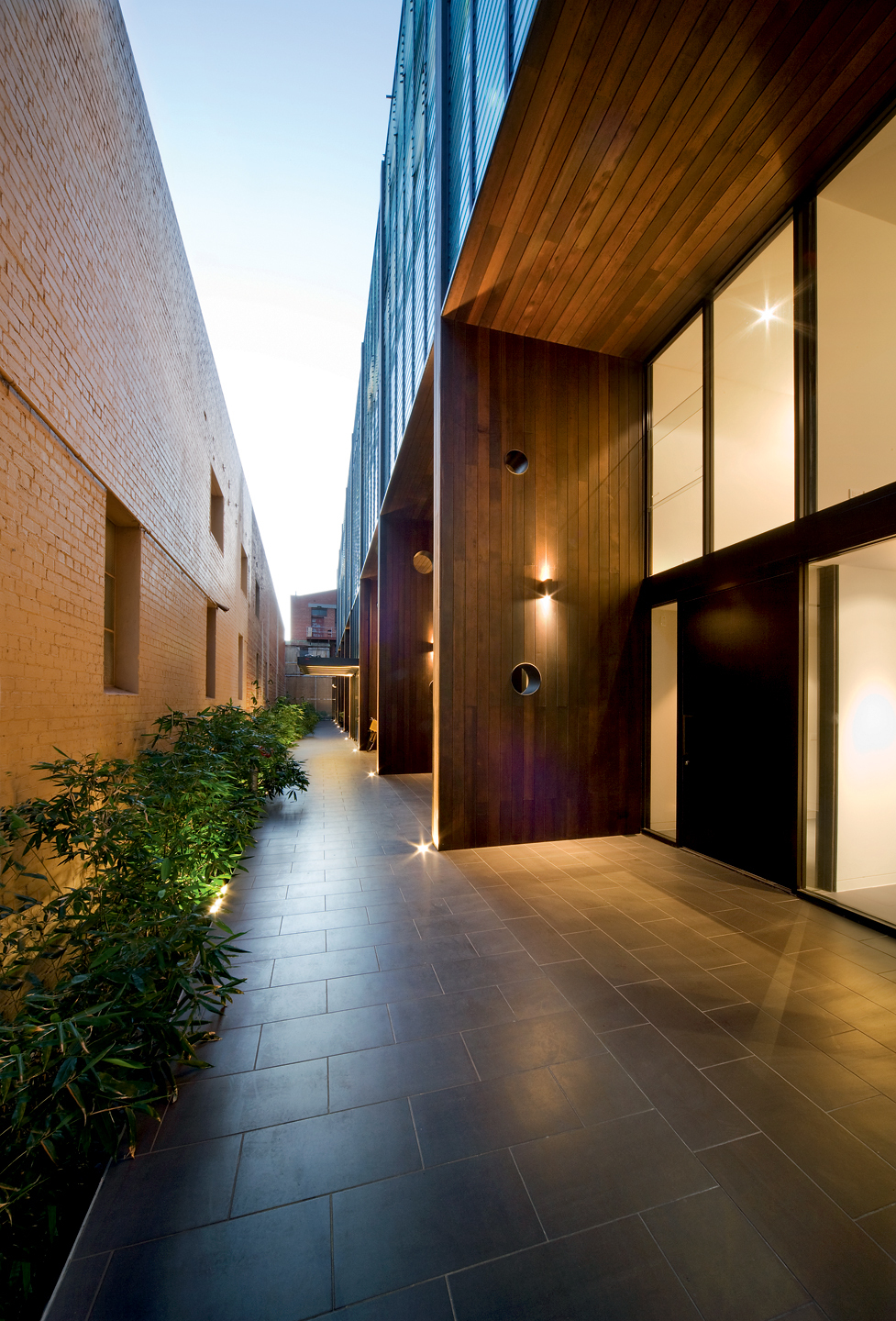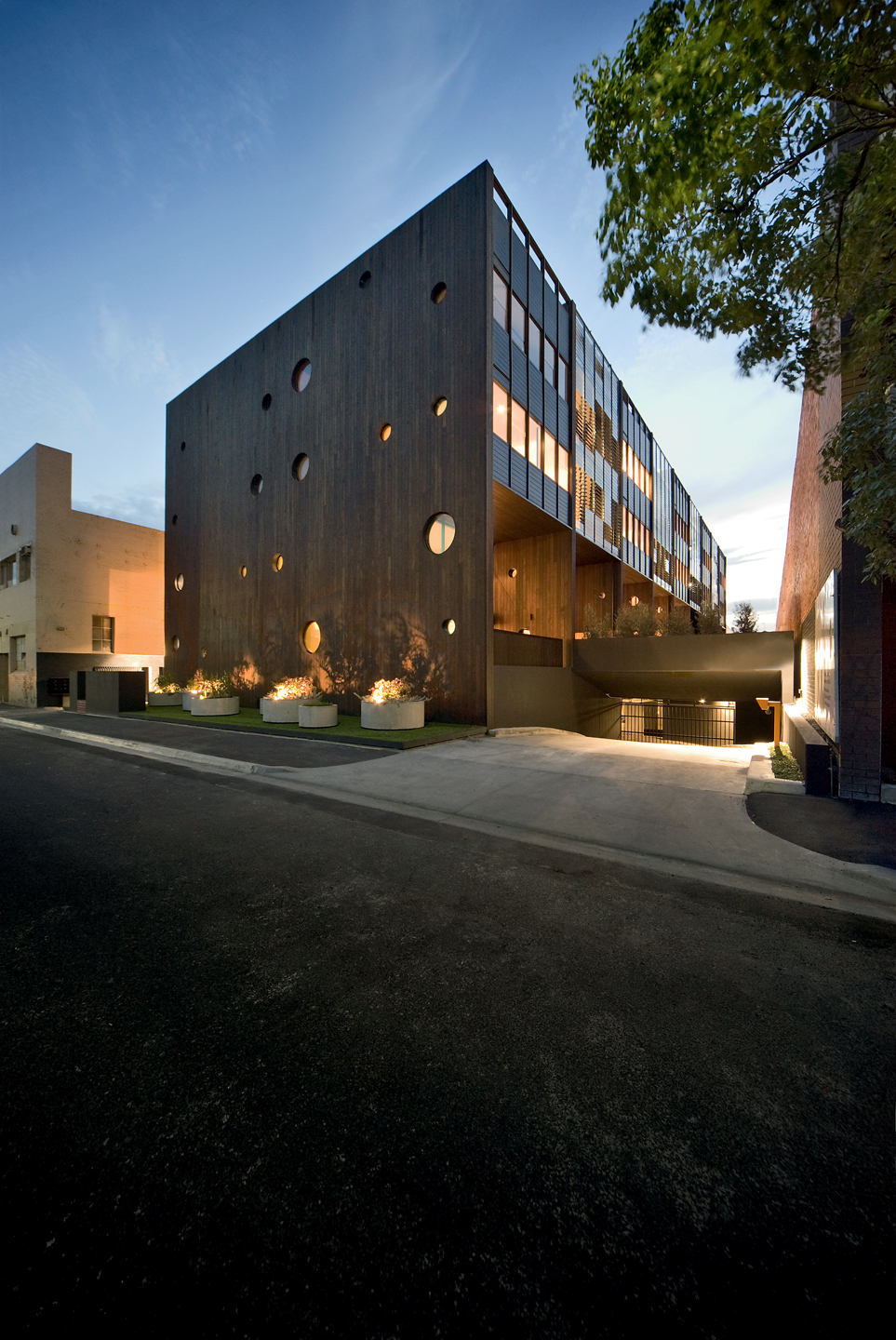 Located in Richmond, Australia, the Hue is a 5 storey apartment building designed by Jackson Clements. It is divided into 5.4 meter halls emerged from two storey terrace house party walls in the ground levels. The noise and the ventilation are due to the louvres that also allow the balcony spaces to be closed as sunrooms during winter, by this also increasing the livable spaces.