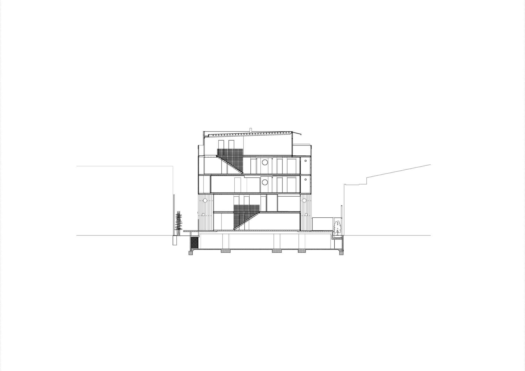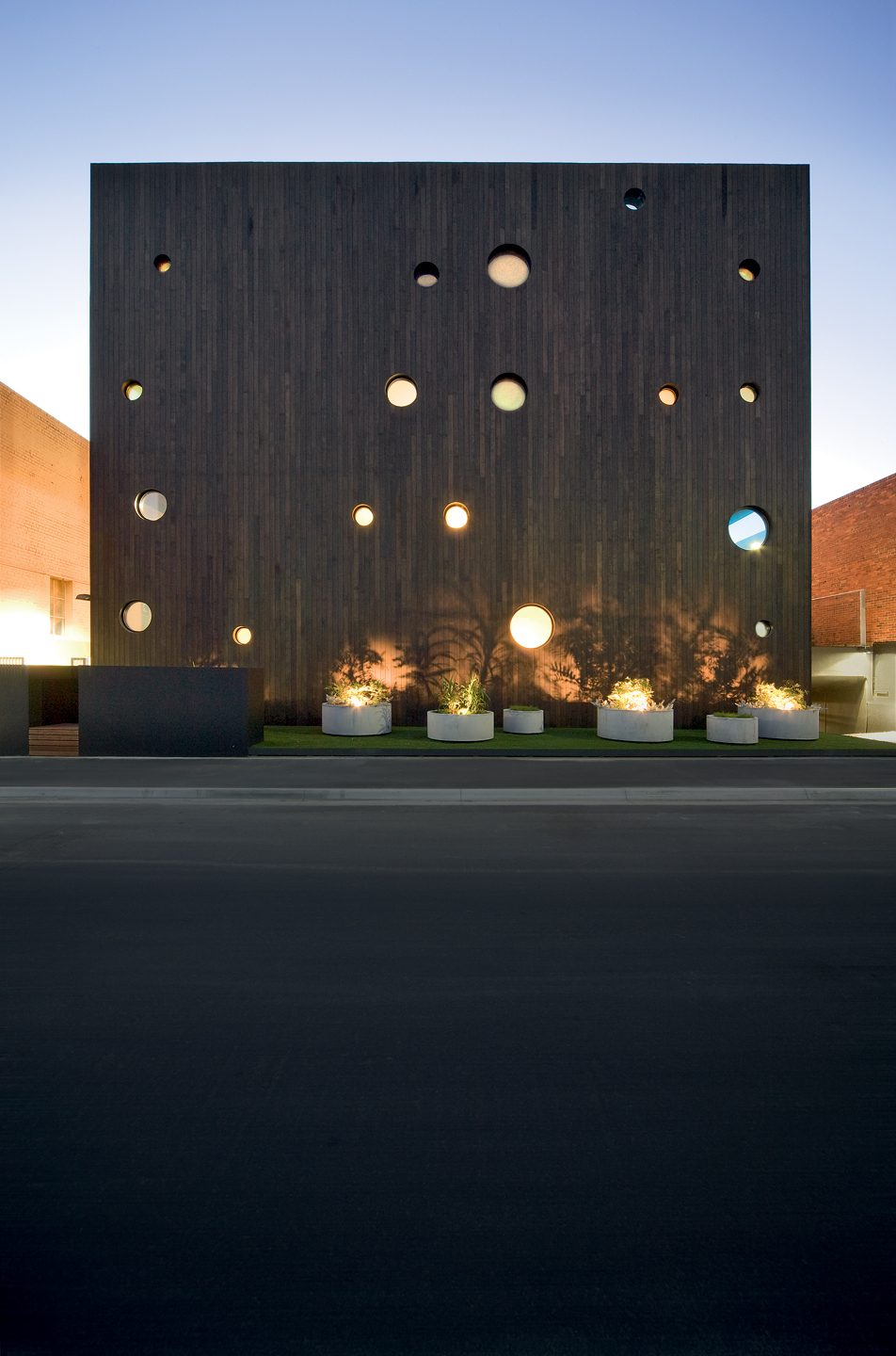 The walls from the eastern and western façade are articulated by different diameters windows, transforming the façade into an enigmatic presence within the street.