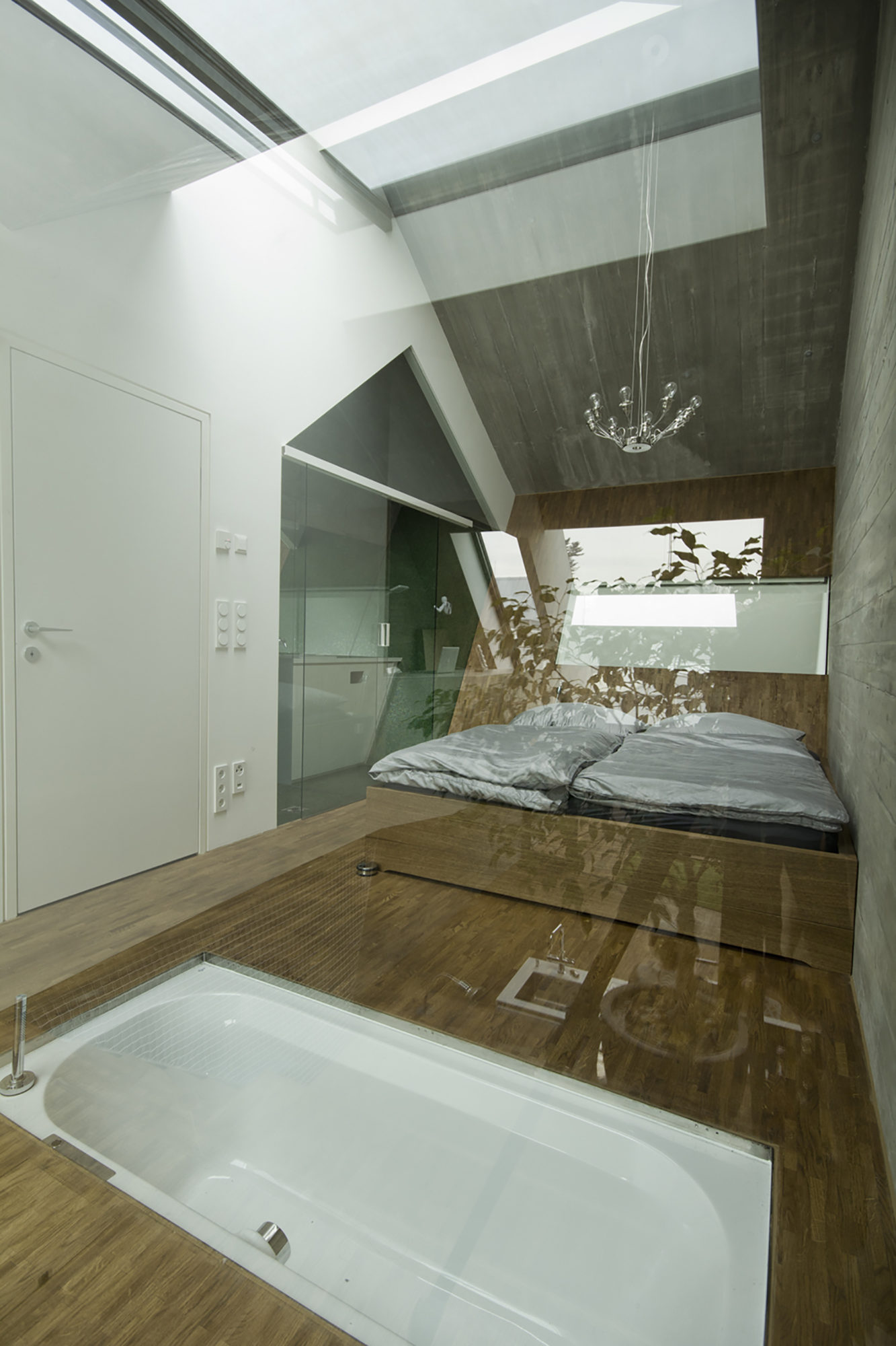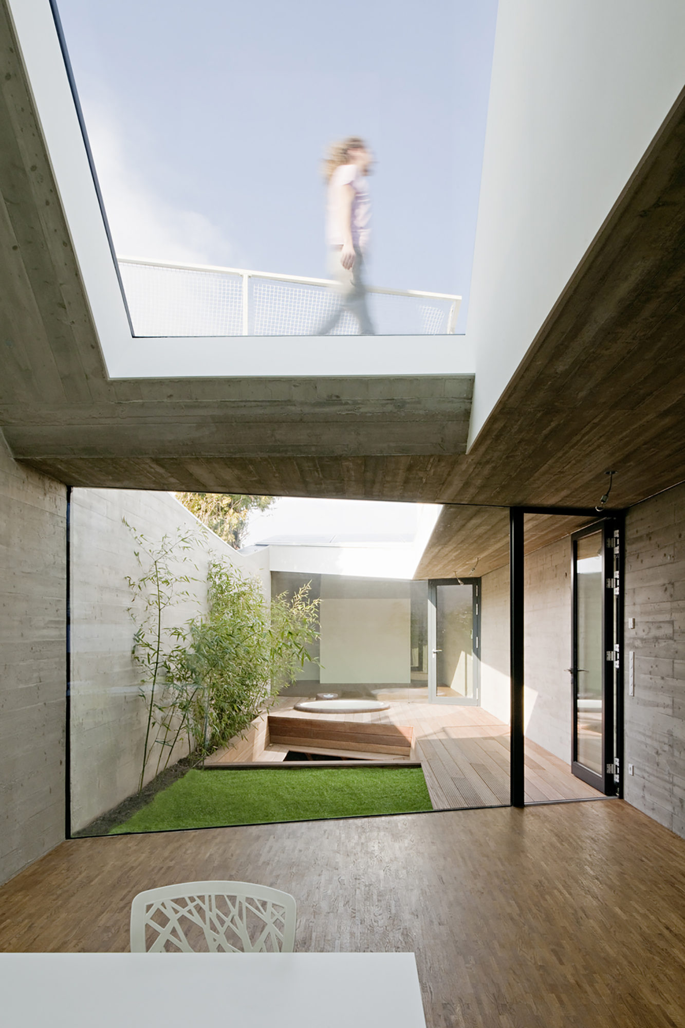 Upon entry, the residents are greeted by a simple, white space that leads towards the main living areas and the atrium garden. The interior color palette involves neutral tones of gray and white that are complemented by the warming appearance of multiple wood elements. The floors, some of the ceilings as well as most of the furniture pieces were made using wood in order to offset the cold appearance of the concrete walls. Transparency is ensured by glass walls and by a skylight that allows the entry area to be flooded with natural light.