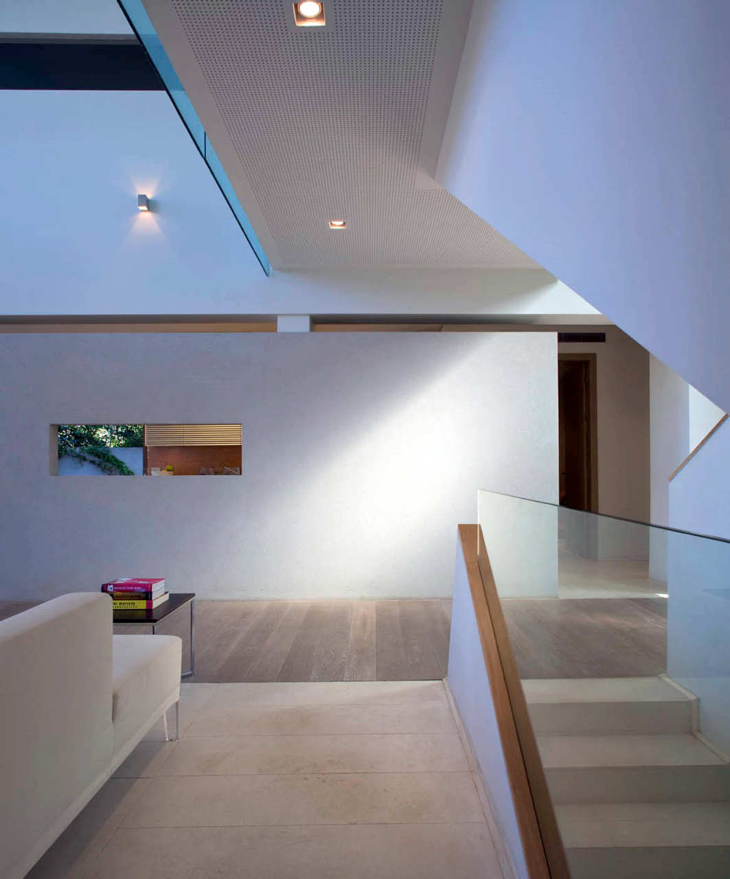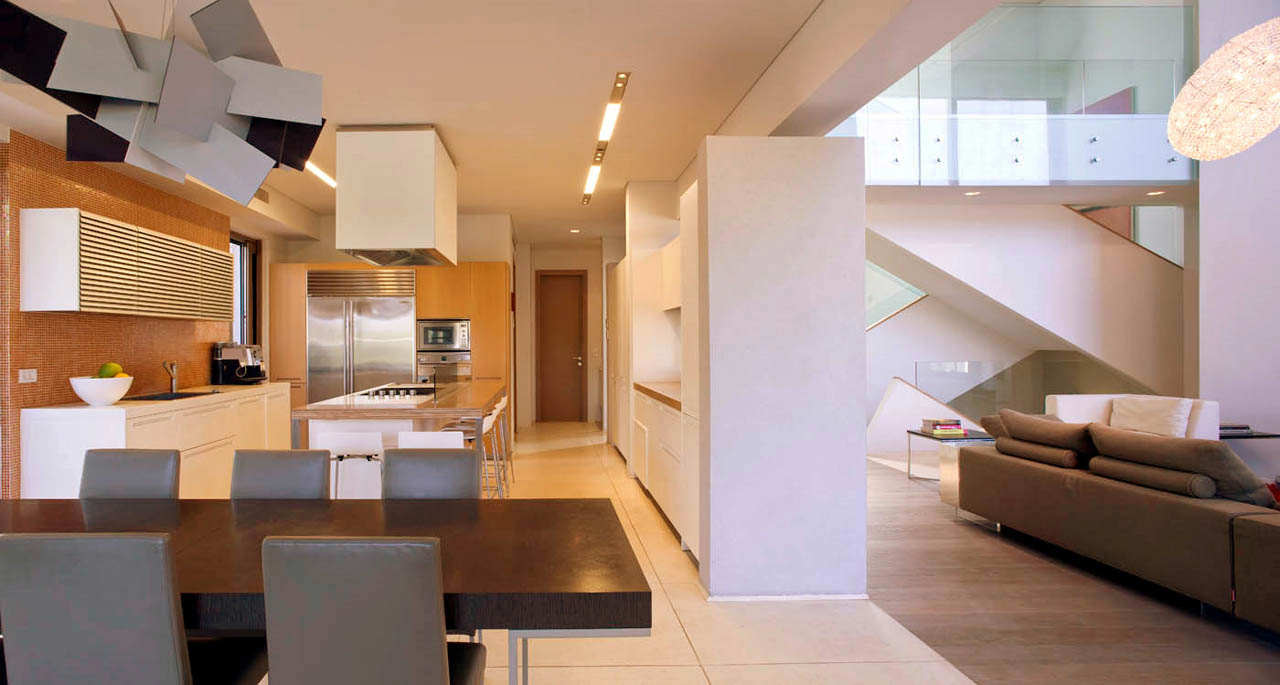 The living room is the intermediate space that connects the two wings with overhead bridges and staircase and features huge glass walls that permit natural views and lights to enter the house.