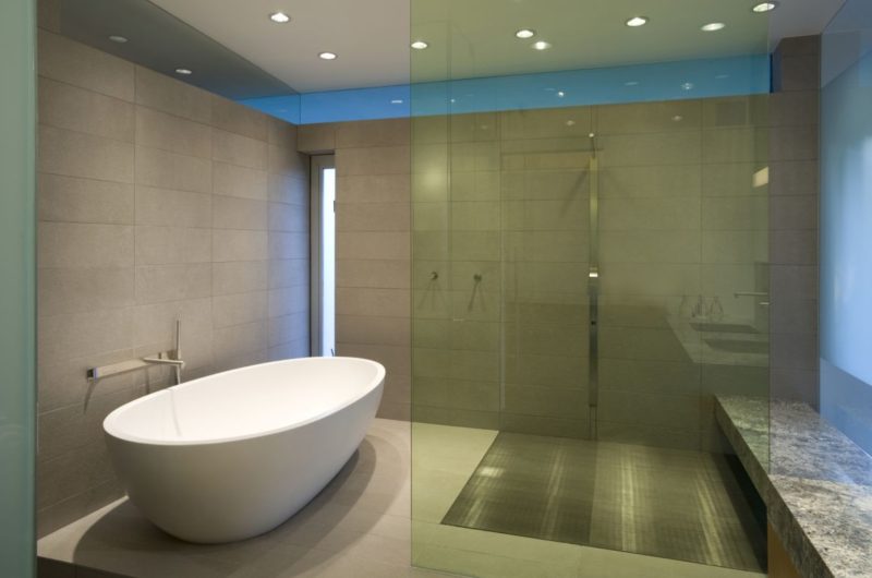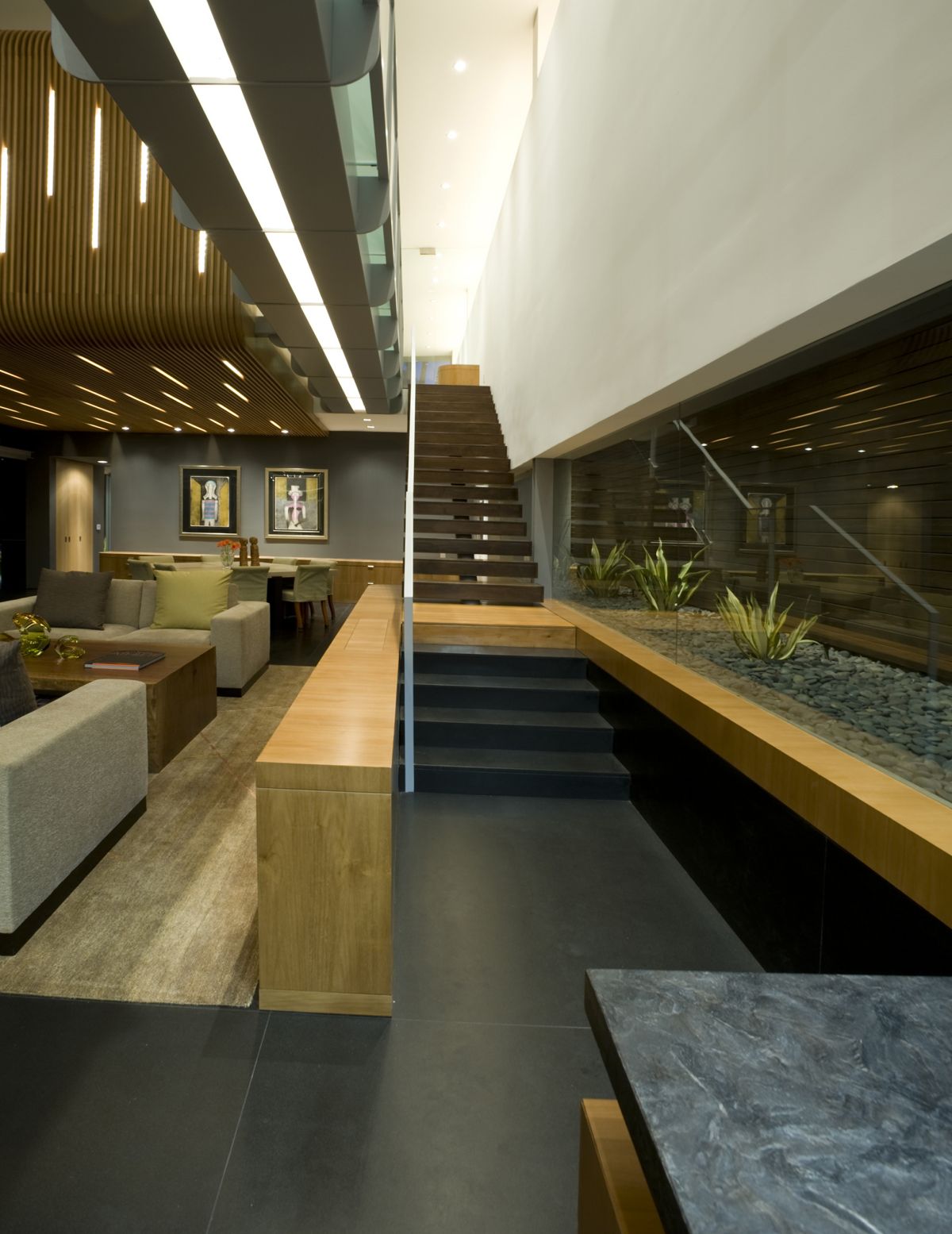 Inside, the interiors include plenty of wood elements that contribute to an atmosphere of warmth and coziness, but glass features and modern spotlight-based lighting arrangements are also a part of the design.