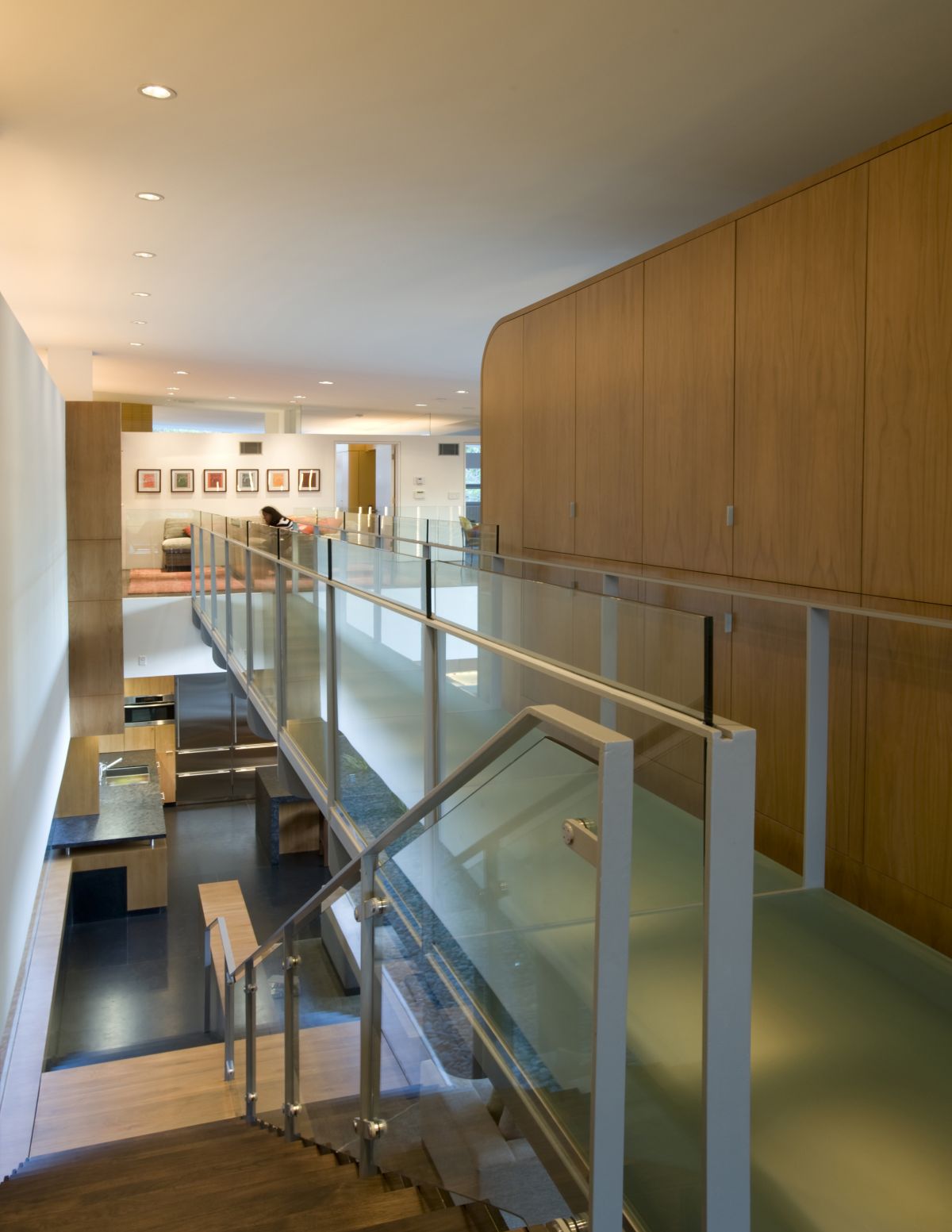 Taking advantage of the lots depth allows the 4000 SF, 4 Bedroom interior program to fit comfortably on two levels rather than following the model of surrounding taller and more resource intensive homes. Due to the lower height and resulting privacy issues, the roof shape was devised as a “shrouded clerestory”, gently folding down over the clerestory space to conduct more subdued reflected sunlight from the horizontal space between the roof and exterior wall while floating gently over the interior spaces.
