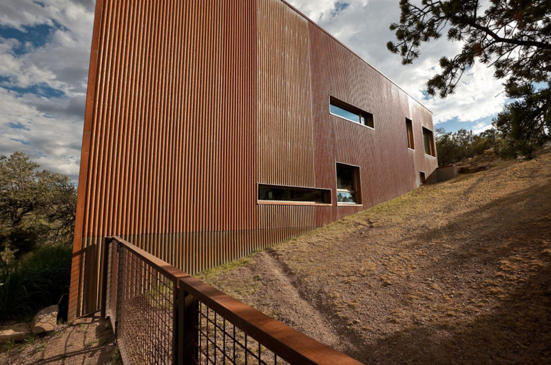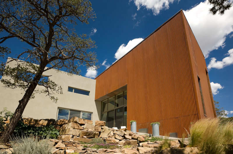 The house is constructed of polished concrete floors, insulated concrete forms (ICF), and recycled wood stud framing. Exterior finishes are stucco and rusted metal roof and wall panels.