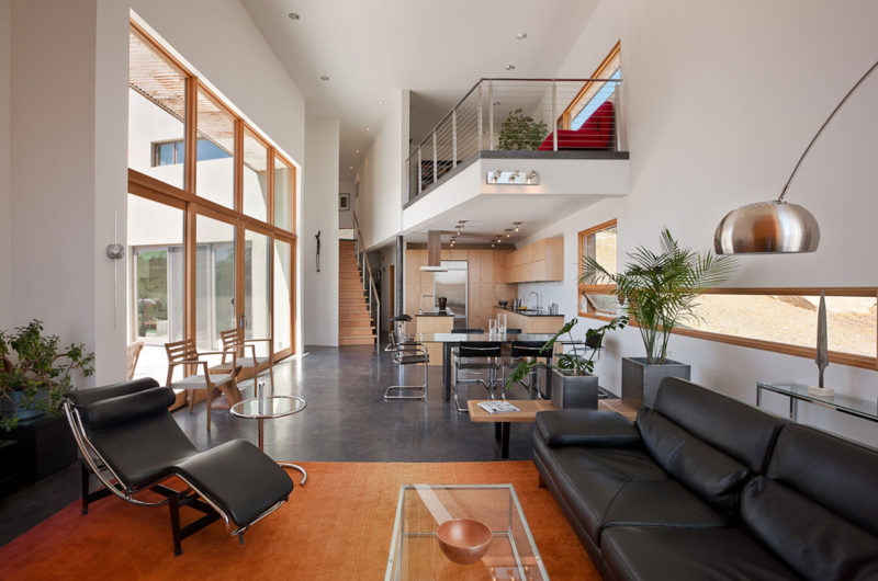 The house utilizes passive solar photovoltaic and hot water roof panels for electricity and in-floor heating. Rain water is collected into underground cisterns for landscape irrigation.”