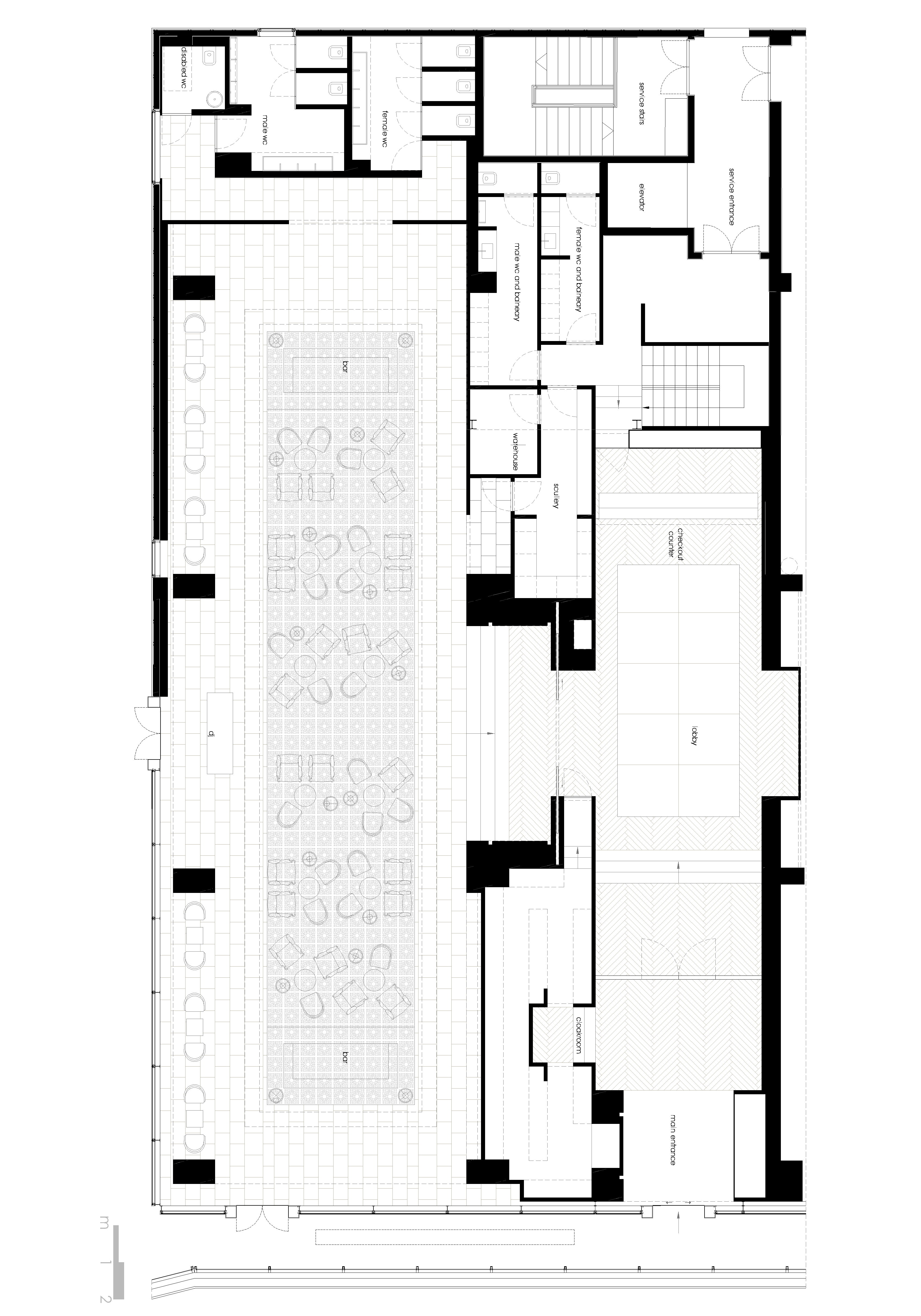 A monumental hall marks the entrance with a contemporary style and leads to the living room of the bar.