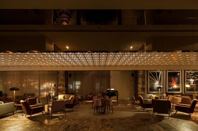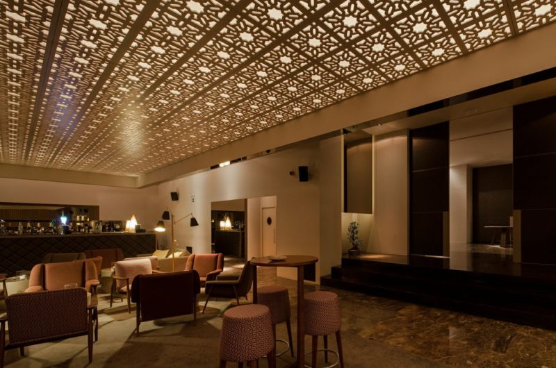 The design of the ceiling comes from a reinterpretation of an oriental motif, standardized by a module that materializes a delicate mesh strongly emphasized by indirect lighting application.
