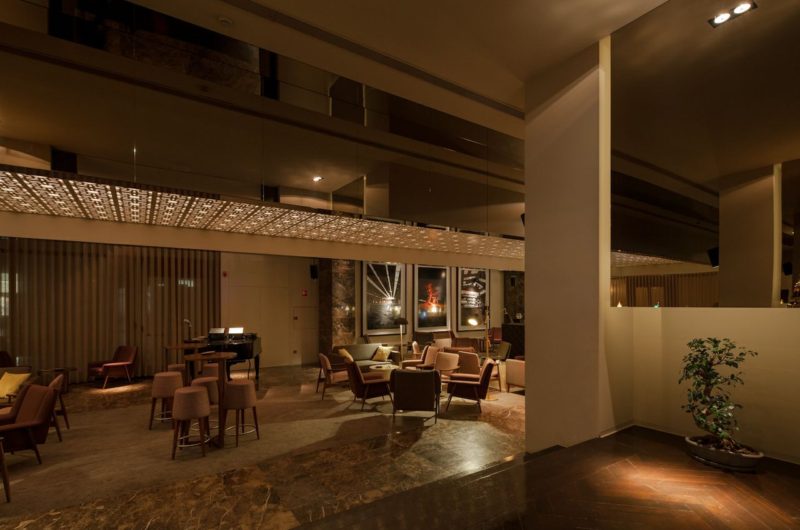 The bar space transports you to a warm environment where a fascinating blend of traditional and contemporary evocative elements lead the client to a private living room.”