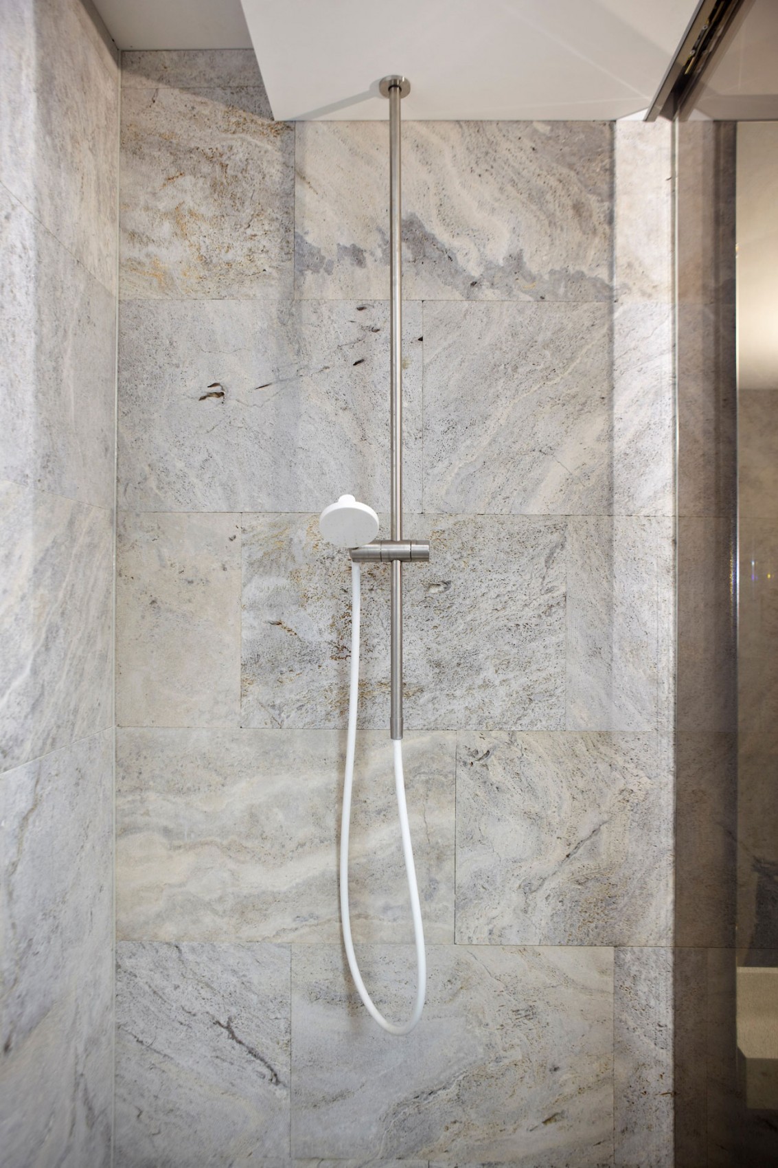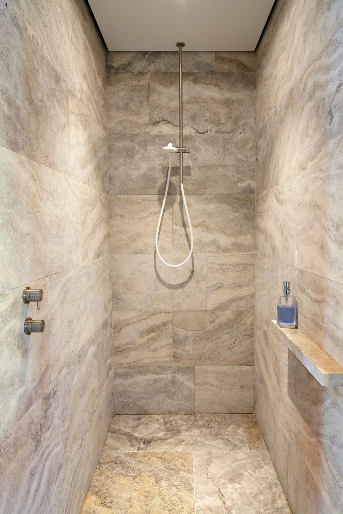 The travertine used on the walls in this alternative way creates a light contrast with the floors, which produces an elegant and quirky appeal. The painstaking attention to detail is reflected in, among other things, the choice of the timeless design of the water taps, which forms a perfect match with the travertine.