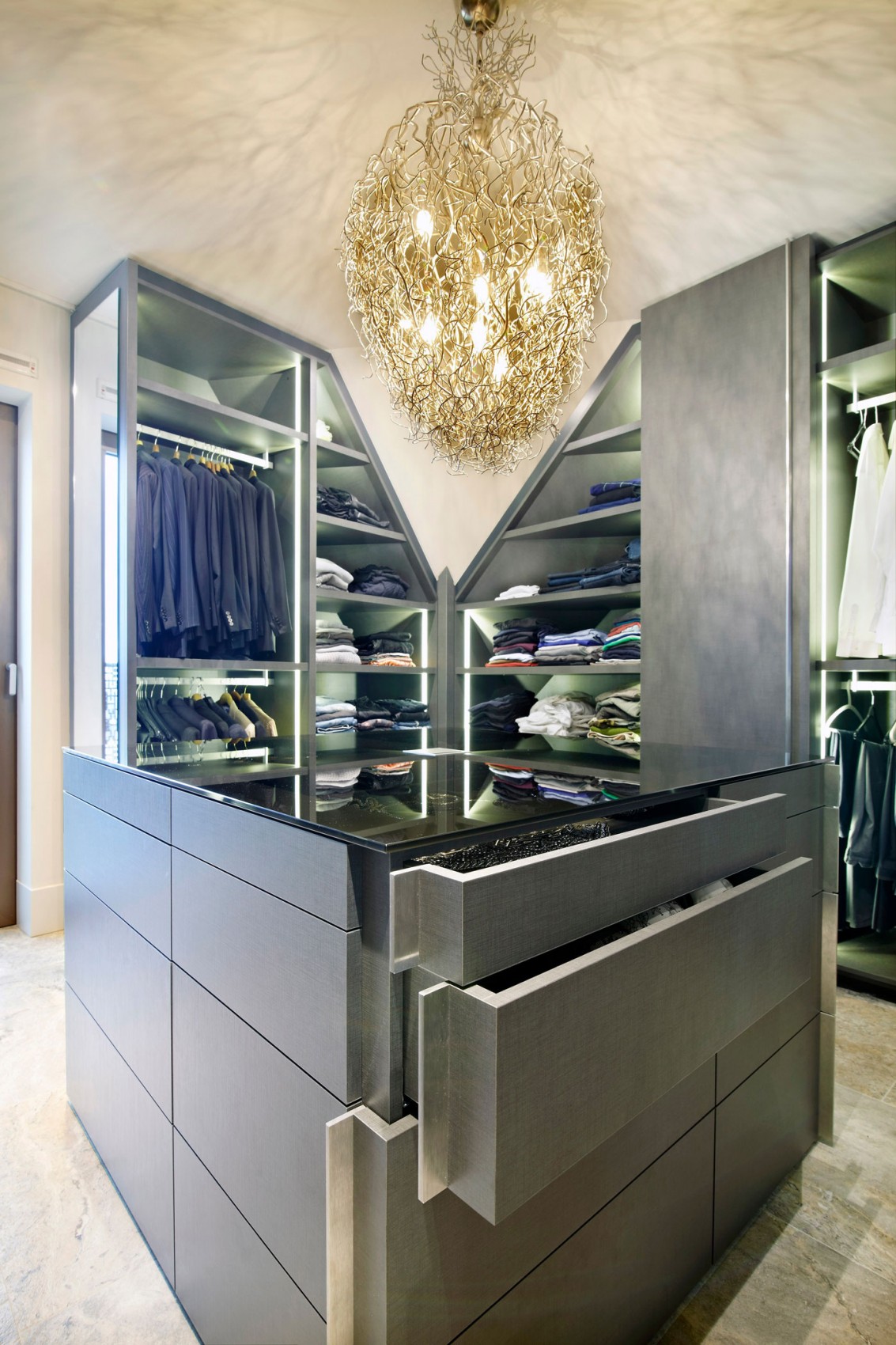 This material was used for the floors and for the walls, and it creates a superb contrast while adding a touch of liveliness. The dressing room features a superb chandelier as well as a central dresser with multiple drawers and a glass top. The dining area and kitchen are flooded with natural light through large windows and provide a cozy setting for socialization.