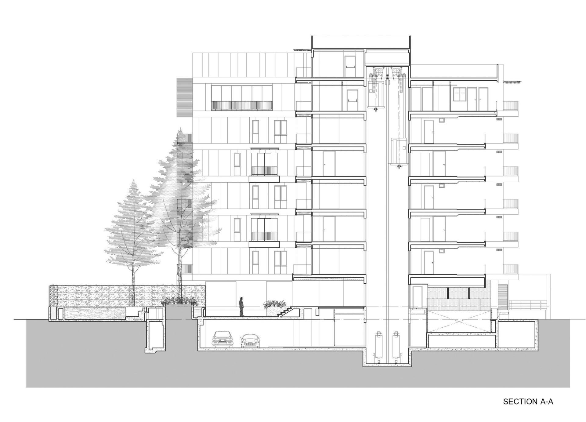 In order to make sure that the apartments would benefit from adequate natural illumination and ventilation, the Pine Crest Residence was divided into 2 separate wings that are in turn separated by a garden court found at the core of the dwelling. Furthermore, this garden court incorporates a larger pine tree that can be admired in its entire splendor from within the apartments.