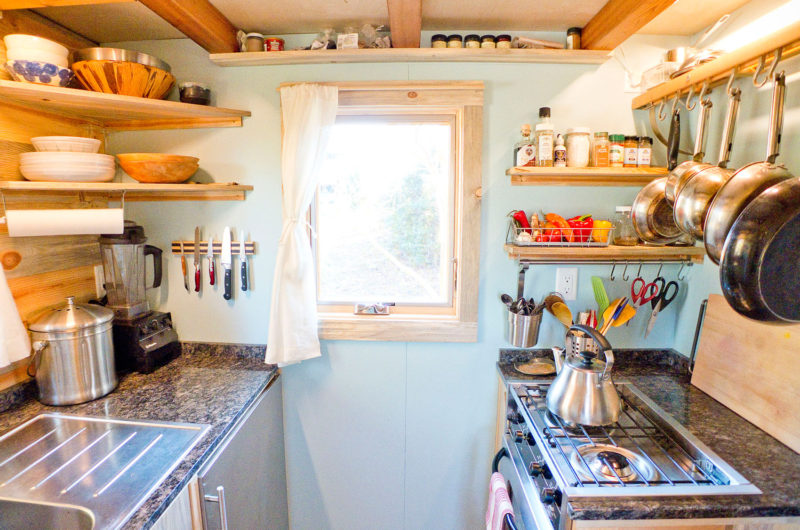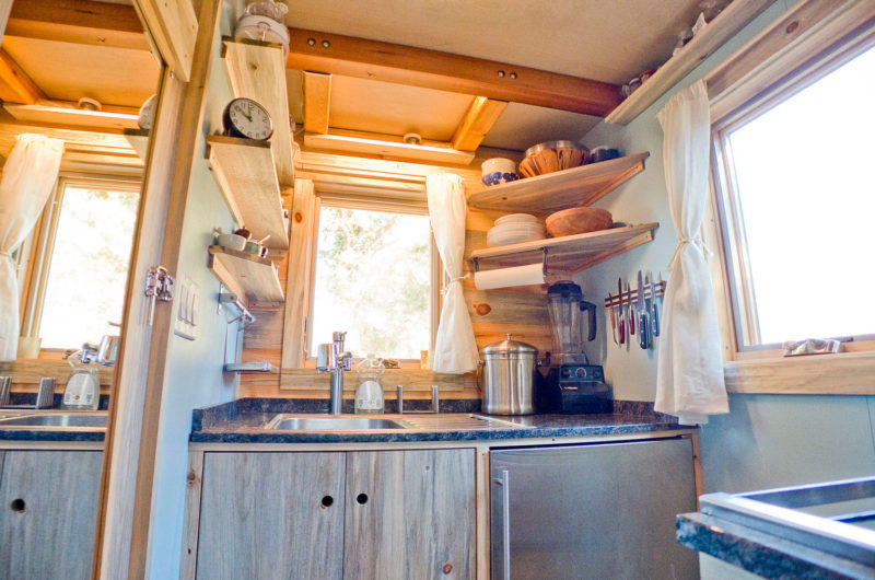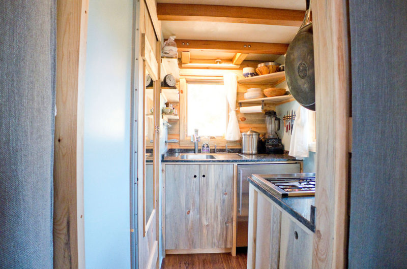 The home features 10 windows and a glass door, which means that it is constantly flooded by natural light. Moreover, since it was designed to be self-sustainable, the Tiny Project boasts passive solar heating as well as blue-stain beetle-kill ponderosa pine ceilings and walls. The inside of the residence is packed with all the necessary appliances and amenities necessary to sustain a comfortable lifestyle. As we mentioned before, the Tiny Project is a mobile home, and once it is parked at a convenient location, it only requires an extension cord and a water hose to operate properly. Solar panels and water collection systems can also be added if the location proves to be of a more permanent nature.