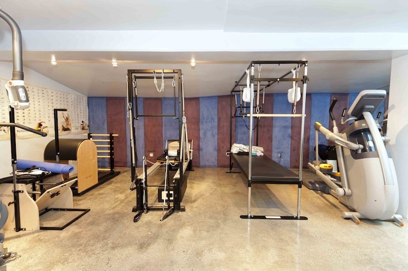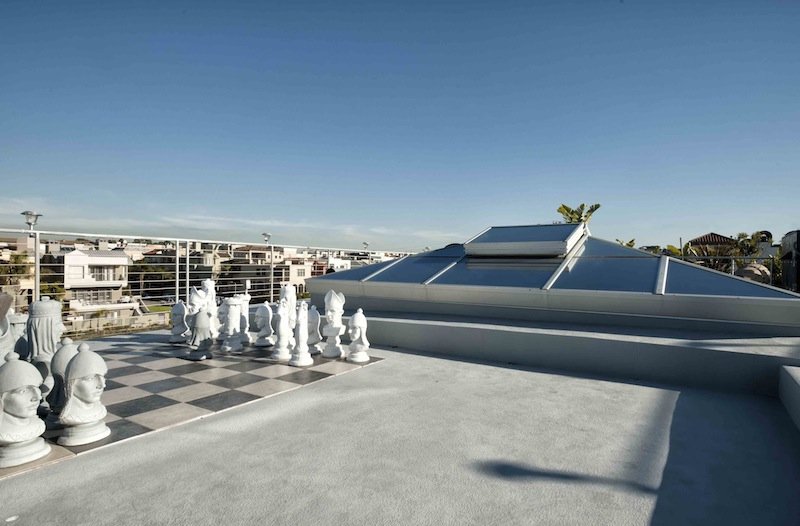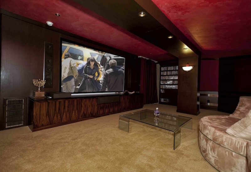 The lowest level houses an onyx walk-in wine room, a wet spa, a screening room, a disco ball room, a gym, a guest bedroom and two bathrooms. At the ground level there is a 5-car-garage, two bedrooms with bathrooms and a kitchen.