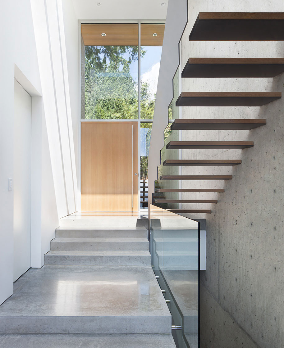 Tucked into the hill, the front of the house is deceptively modest in scale, set off by the large mature cedar that anchors the front yard. The topography of the site reveals itself as one descends the exterior stairs adjacent to the forest and follows the exposed concrete wall to the main entry. Continuing through to the interior, the wall rises up seventeen feet to help frame the bright circulation volume, with stairs leading to the upper floor and down to the main living spaces.