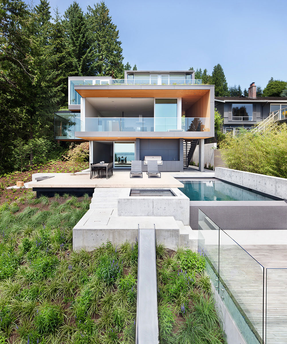 This project is located in West Vancouver on a steep site with mature cedar and douglas fir to the west and an ocean view to the south. The house responds to these conditions by nestling itself into the hill while also projecting out over it to maximize views and connectivity to the landscape.