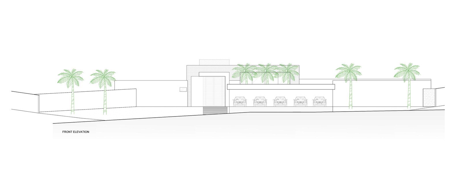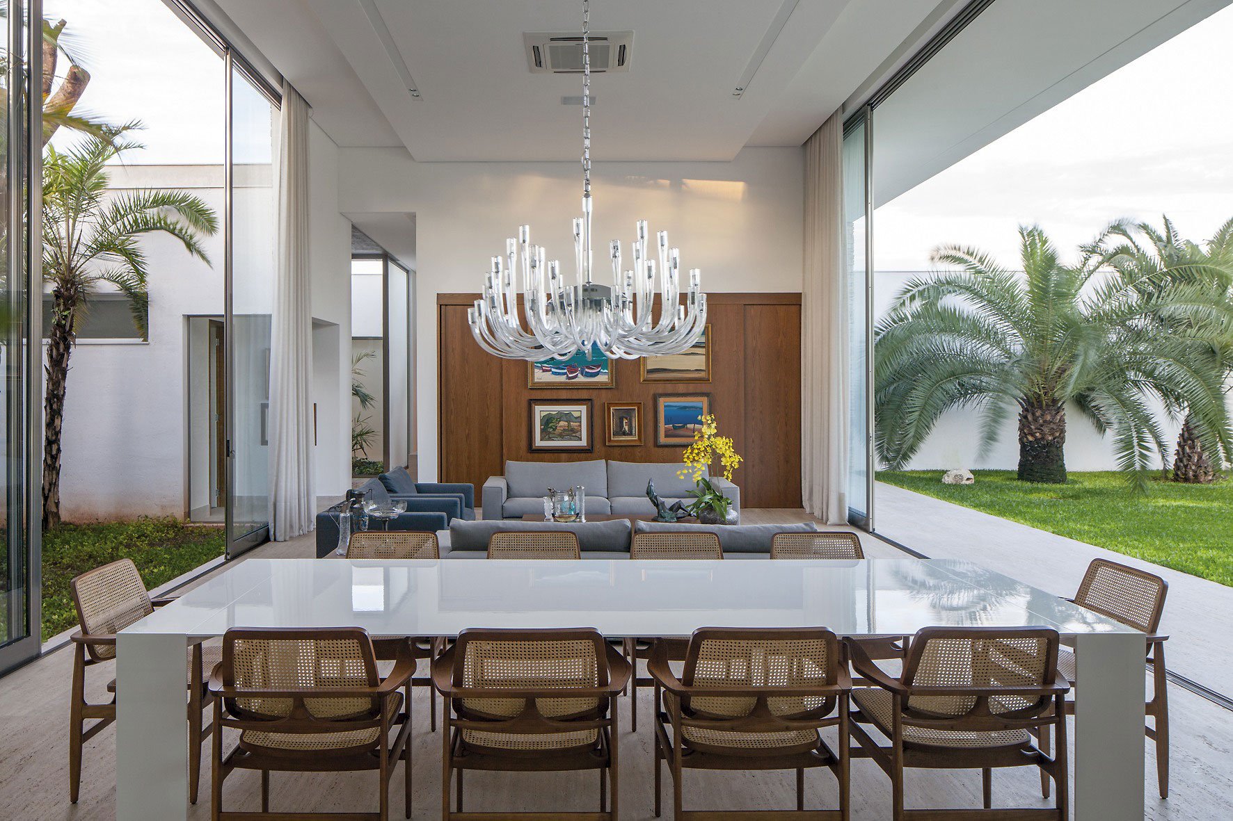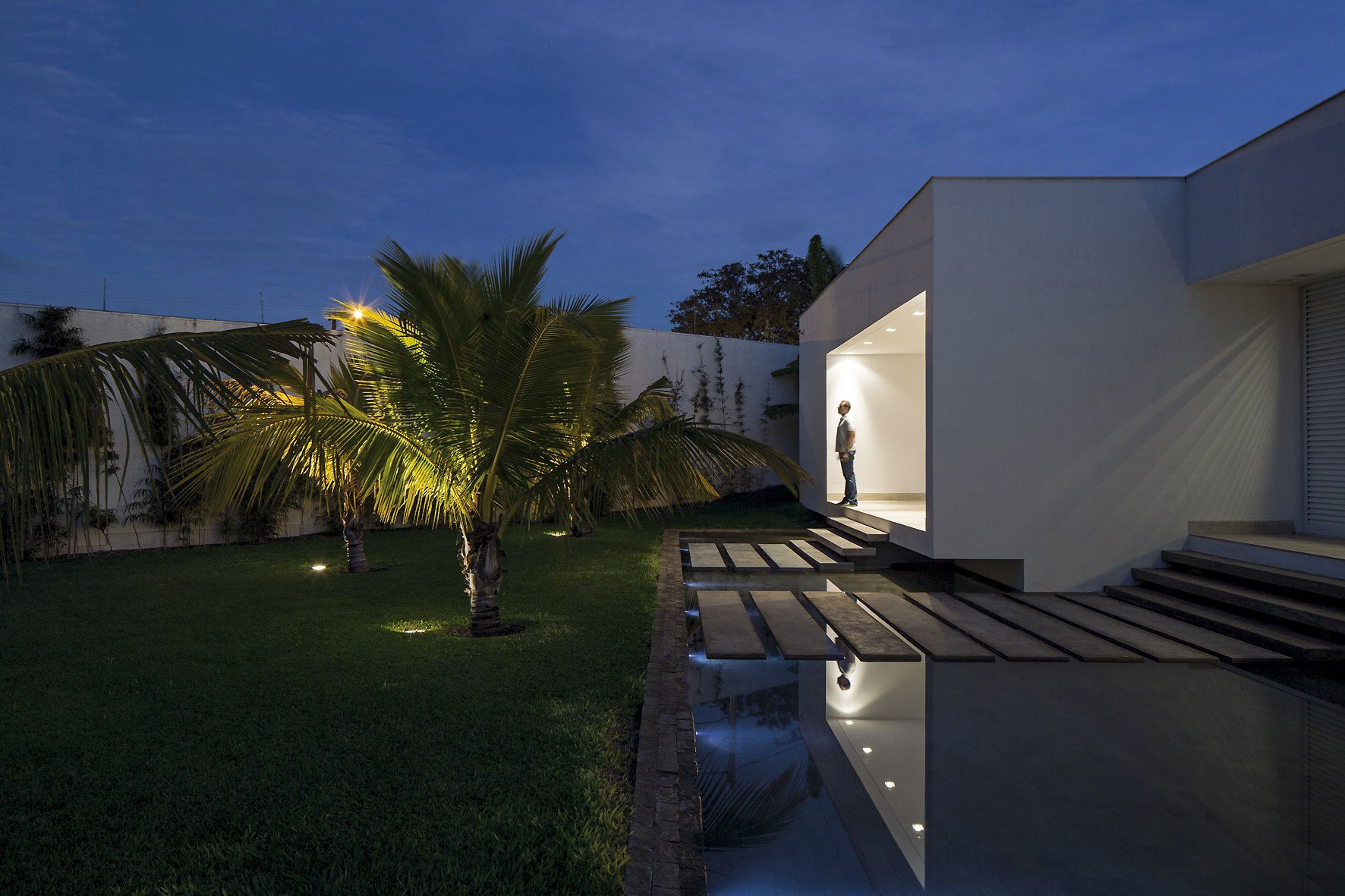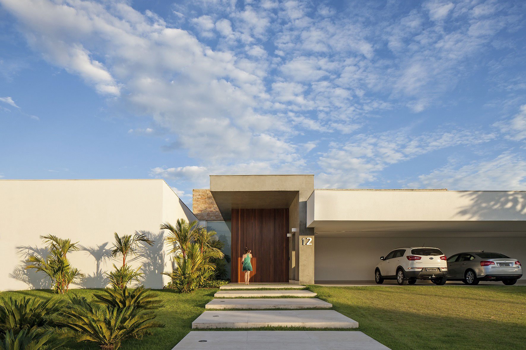 In the front façade the garage’s suspended concrete slab (15 m) provides shelter for five cars. The entrance portico is in concrete, which also covers the entrance hallway leading to the main body of the residence. The hallway is separated from the garden on one side by a glass wall, allowing light to enter the entrance hall and the corridor leading to the sleeping quarters. A ribbed cumaru wood panel conceals the floor-to-ceiling front door.